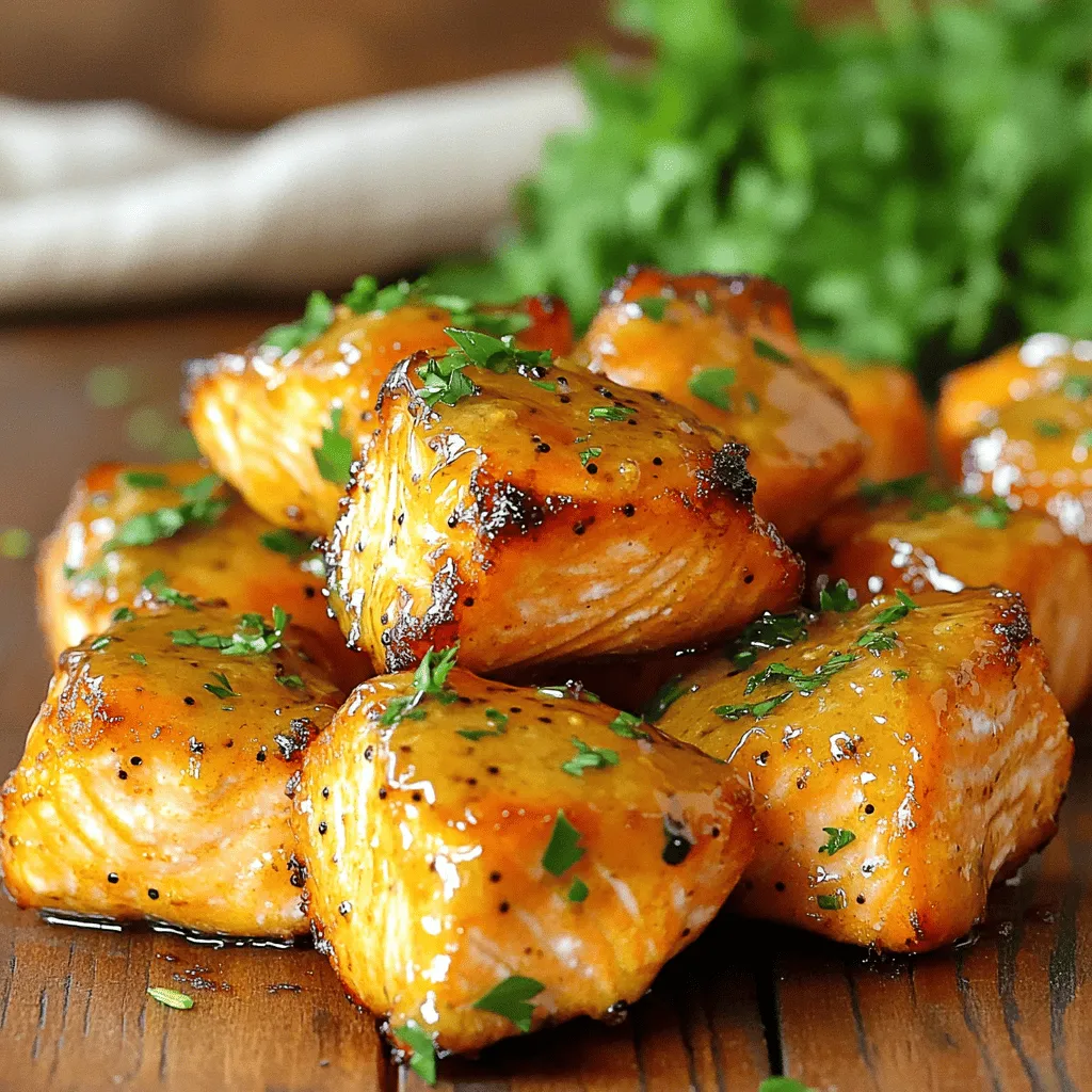 You need 1 pound of fresh salmon fillet. Make sure the skin is off and cut it into bite-sized pieces. This helps the salmon cook evenly and makes it easy to eat. Fresh salmon gives the best taste. For the marinade, gather these items: - 2 tablespoons honey - 2 tablespoons Dijon mustard - 1 tablespoon soy sauce - 1 teaspoon garlic powder - 1 teaspoon smoked paprika - Salt and pepper to taste These ingredients create a sweet and tangy flavor. Honey adds sweetness, while Dijon mustard gives it a nice bite. Soy sauce adds depth, and garlic powder and smoked paprika bring warmth. For a beautiful finish, consider using fresh chopped parsley. It adds color and a fresh taste. You can also serve with lemon wedges. The lemon gives a bright flavor that pairs well with salmon. To start, gather your ingredients. In a medium bowl, mix: - 2 tablespoons honey - 2 tablespoons Dijon mustard - 1 tablespoon soy sauce - 1 teaspoon garlic powder - 1 teaspoon smoked paprika - A pinch of salt and pepper Whisk these until smooth. This blend creates a rich and tasty marinade. Next, take your fresh salmon fillet, cut it into bite-sized pieces. Place the salmon in the bowl with the marinade. Make sure each piece gets coated well. Cover the bowl and let it sit for 15-20 minutes. This allows the flavors to soak in deeply. Once the salmon is marinated, preheat your air fryer to 400°F (200°C) for about 5 minutes. Lightly spray the air fryer basket with non-stick spray. This step ensures the salmon won’t stick. Arrange the salmon bites in a single layer in the basket. Avoid crowding them. Cook for 8-10 minutes, flipping halfway through. The salmon should look golden and flaky when done. After cooking, let the bites rest for a minute. This keeps them juicy. Finally, sprinkle fresh chopped parsley on top before serving. Enjoy! To ensure your honey mustard salmon bites burst with flavor, let them marinate. I recommend at least 20 minutes. This time allows the salmon to soak up the marinade. The mix of honey, Dijon mustard, soy sauce, and spices creates a bold taste. For a sweet touch, adjust the honey. If you prefer more heat, add a dash of cayenne pepper. Cooking time can change based on salmon bite size. Smaller pieces may cook faster, around 6-8 minutes. Larger chunks might need 10-12 minutes. Always check for doneness. The salmon should flake easily with a fork. If needed, return it to the air fryer for a few more minutes. Serve your salmon bites with lemon wedges for a zesty kick. Fresh parsley adds color and flavor. Pair them with a light salad or some steamed veggies. These bites also work great as an appetizer or snack. Don't forget to offer toothpicks for easy serving! {{image_4}} You can switch up the marinade to fit your taste. Try using maple syrup instead of honey for a sweeter kick. You can also use whole grain mustard instead of Dijon for extra texture. If you like heat, add a dash of hot sauce to the mix. This gives your salmon bites a nice spice. If you don't have fresh salmon, you can use canned salmon. Just drain it well and break it into bite-sized pieces. For a gluten-free option, swap soy sauce with tamari. You can also replace garlic powder with fresh minced garlic for a stronger flavor. Don't hesitate to be creative with what you have! These salmon bites pair well with many sides. Try serving them with a fresh salad for a light meal. Roasted veggies are another great choice. You can also serve them with rice or quinoa for a heartier dish. Don't forget about dipping sauces like tzatziki or a spicy mayo. To store leftovers, place the salmon bites in an airtight container. This keeps them fresh. You can refrigerate them for up to three days. Make sure they cool down before sealing. This helps avoid excess moisture. When you're ready to eat, reheating is key. I suggest using the air fryer again. Set it to 350°F (175°C) for about five minutes. This method keeps them crispy. You can also use the microwave, but it may make them soggy. If you choose the microwave, heat them for 30 seconds at a time. You can make these salmon bites ahead. Marinate the salmon and store it in the fridge for up to 24 hours. This lets the flavors deepen. When you’re ready, pop them in the air fryer. They cook quickly, making this a great meal prep option. You should air fry salmon bites for 8 to 10 minutes. Flip them halfway for even cooking. When done, they should look golden and flaky. Yes, you can use frozen salmon. Just thaw it first before marinating. This ensures the marinade sticks well. Set your air fryer to 400°F (200°C). This high heat cooks the salmon quickly and makes it crispy. This blog detailed how to prepare flavorful air-fried salmon. We discussed key ingredients, like fresh salmon and marinade choices. I walked you through simple steps for marinating and air frying. We also shared tips for flavor and cooking times. Lastly, we explored variations and storage options. Air-fried salmon is easy and tasty. You can enjoy it as a meal or snack!
