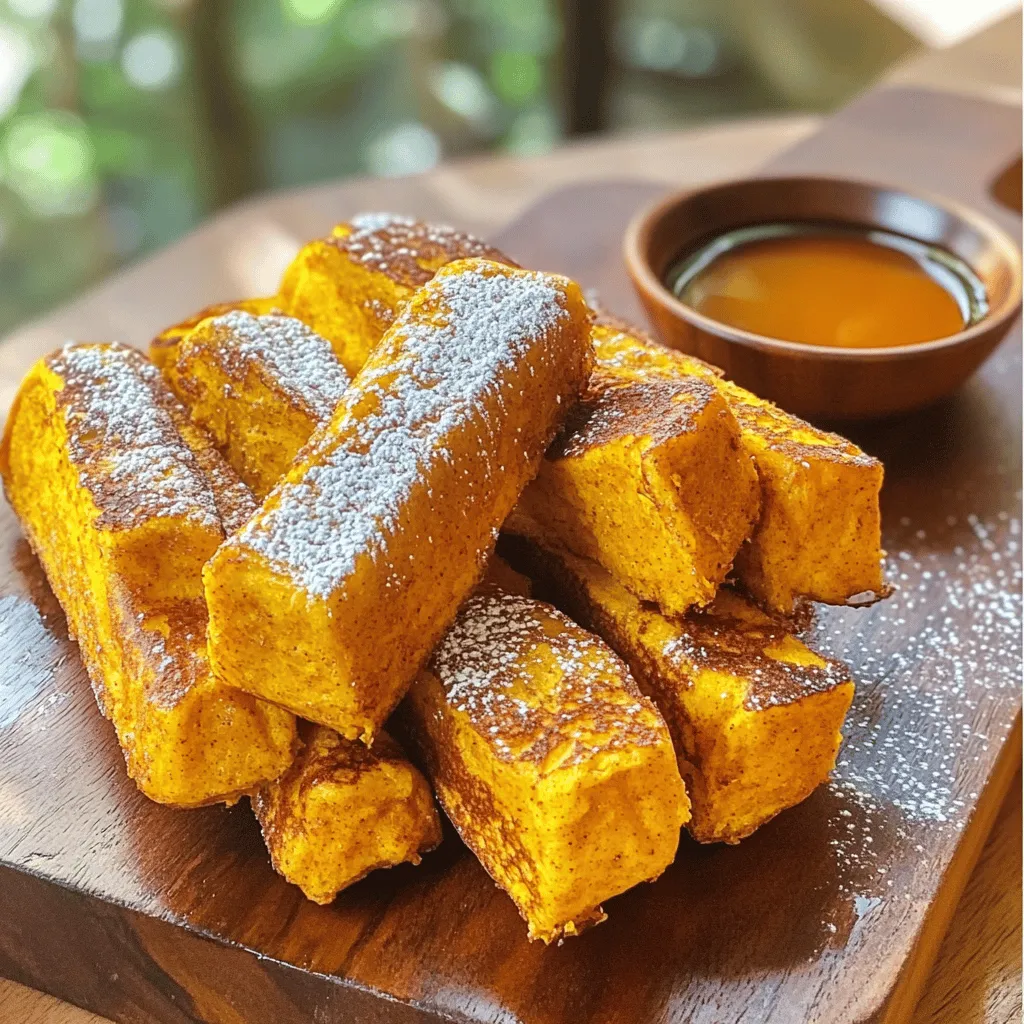 To make Air Fryer Pumpkin Spice French Toast Sticks, gather these key ingredients: - 1 cup pumpkin puree - 2 large eggs - 1 teaspoon vanilla extract - 1 teaspoon pumpkin pie spice - ¼ teaspoon salt - 1 cup milk (dairy or non-dairy) - 8 slices thick bread (like brioche or challah) These ingredients blend together to create a tasty batter that coats the bread sticks. You can add a touch of sweetness with these optional ingredients: - 1 tablespoon sugar (for added sweetness) - Cooking spray or oil for the air fryer These extras help enhance the flavor and texture of the dish. If you have specific dietary needs, consider these substitutions: - Use almond milk or oat milk instead of regular milk for a dairy-free option. - Choose gluten-free bread to make this dish gluten-free. - You can skip the sugar if you want a lower-sugar version. These options allow everyone to enjoy this delicious treat while meeting their dietary needs. Start by mixing the pumpkin puree, eggs, and vanilla in a bowl. Add the pumpkin pie spice, salt, and sugar if you want it sweet. Whisk until it is smooth and free of lumps. Then, slowly pour in the milk while whisking. Keep mixing until the batter is creamy and well blended. This pumpkin mixture adds rich flavor to your French toast sticks. Cut each slice of thick bread into three equal sticks. This makes them easy to dip and eat. Now, dip each stick into the pumpkin mixture. Make sure each piece gets a good coat, but don’t let it soak. Shake off any extra batter. This helps prevent soggy sticks later on. Preheat your air fryer to 360°F (182°C). Arrange the coated sticks in a single layer in the air fryer basket. Avoid overlapping them to ensure even cooking. Lightly spray the sticks with cooking spray or drizzle a little oil on top. Cook them for 10-12 minutes, flipping halfway through. This gives them a golden brown color and a nice crunch. When they are done, let them cool for a few minutes before serving. Enjoy them warm, with syrup or powdered sugar on top for a sweet treat! To make sure your French toast sticks cook evenly, follow these tips. First, cut the bread into equal-sized sticks. This helps them cook at the same rate. Next, don’t overcrowd the air fryer basket. Leave space between each stick. This allows hot air to flow around them. If your air fryer is small, cook in batches. Lastly, remember to flip the sticks halfway through cooking. This way, both sides get nice and golden. For that perfect crunch, you need to coat the sticks just right. Dip them quickly in the pumpkin mix. Don’t let them soak too long, or they will become soggy. After dipping, shake off the extra mixture. A light spray of cooking spray or a drizzle of oil helps too. This adds crispiness as they cook. Make sure to air fry at 360°F (182°C) for 10-12 minutes. The result should be golden brown and crunchy. These pumpkin spice French toast sticks taste amazing on their own. For a fun twist, serve them with maple syrup for dipping. You can also sprinkle some powdered sugar on top for sweetness. Want more flavor? Try cinnamon or nutmeg as a garnish. Arrange the sticks in a fan shape on a plate. A small bowl of syrup in the center makes it look great. These simple touches make your dish even more inviting! {{image_4}} You can change the spice mix to suit your taste. Try using cinnamon or nutmeg instead of pumpkin pie spice. You can also add ginger for a warm kick. Just one teaspoon of your new spice will elevate the flavor. Mixing spices gives your French toast sticks a unique twist. While maple syrup is classic, you have many choices. Honey adds sweetness without being too sticky. You can also try a yogurt dip mixed with vanilla. For a fun option, serve with chocolate or peanut butter sauce. These dips add a new layer of flavor to your French toast sticks. Bread choice affects taste and texture. Thick breads like brioche or challah are great. You can also use whole grain for a healthy twist. Gluten-free bread works well too if you need a substitute. Each type of bread gives a different taste to your dish, making it special every time. You should store leftover French toast sticks in an airtight container. Place them in the fridge. They will stay fresh for about three days. If you want to keep them longer, consider freezing. To reheat, set your air fryer to 350°F (175°C). Place the sticks in the basket. Heat for about 5 minutes until warm. You can also use a microwave, but the air fryer gives a better crunch. If you want to freeze the sticks, ensure they are fully cooled. Arrange them in a single layer on a baking sheet. Freeze them for about an hour, then place them in a freezer bag. They can last for up to two months in the freezer. To thaw, move them to the fridge overnight before reheating. This method helps keep their texture intact. Yes, you can use regular bread. Thin bread will work, but it may not hold the batter well. I prefer thick bread like brioche or challah for this recipe. Thick bread gives it a nice texture and holds the pumpkin mixture better. If you use thin bread, be quick when dipping to avoid sogginess. To make these sticks dairy-free, swap the milk for any non-dairy milk. Almond, soy, or oat milk works well. Use the same amount as regular milk. The pumpkin mixture will still be creamy and delicious. This change keeps the flavor, while making it friendly for those avoiding dairy. Besides syrup, you can try many tasty toppings. A dusting of powdered sugar adds sweetness. You can also use whipped cream for a rich treat. For a fun twist, try a sprinkle of cinnamon or nutmeg on top. Fresh fruit like sliced bananas or berries also pairs well with these sticks. In this post, we explored how to make a tasty pumpkin dish using simple steps. We discussed key ingredients, optional add-ins for more flavor, and how to adjust recipes for different diets. Plus, we covered tips for perfect cooking and fun variations to try. Finally, we looked at storage options and answer