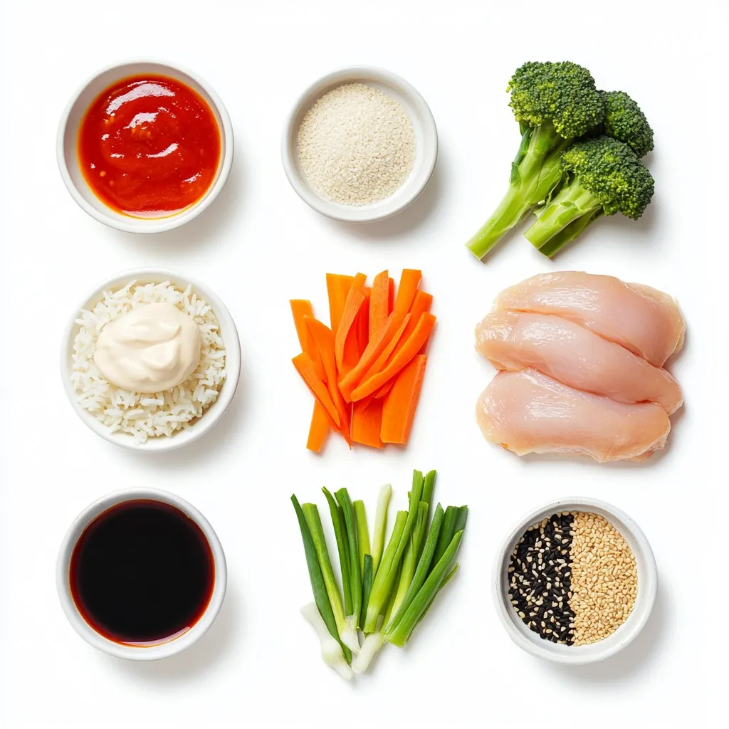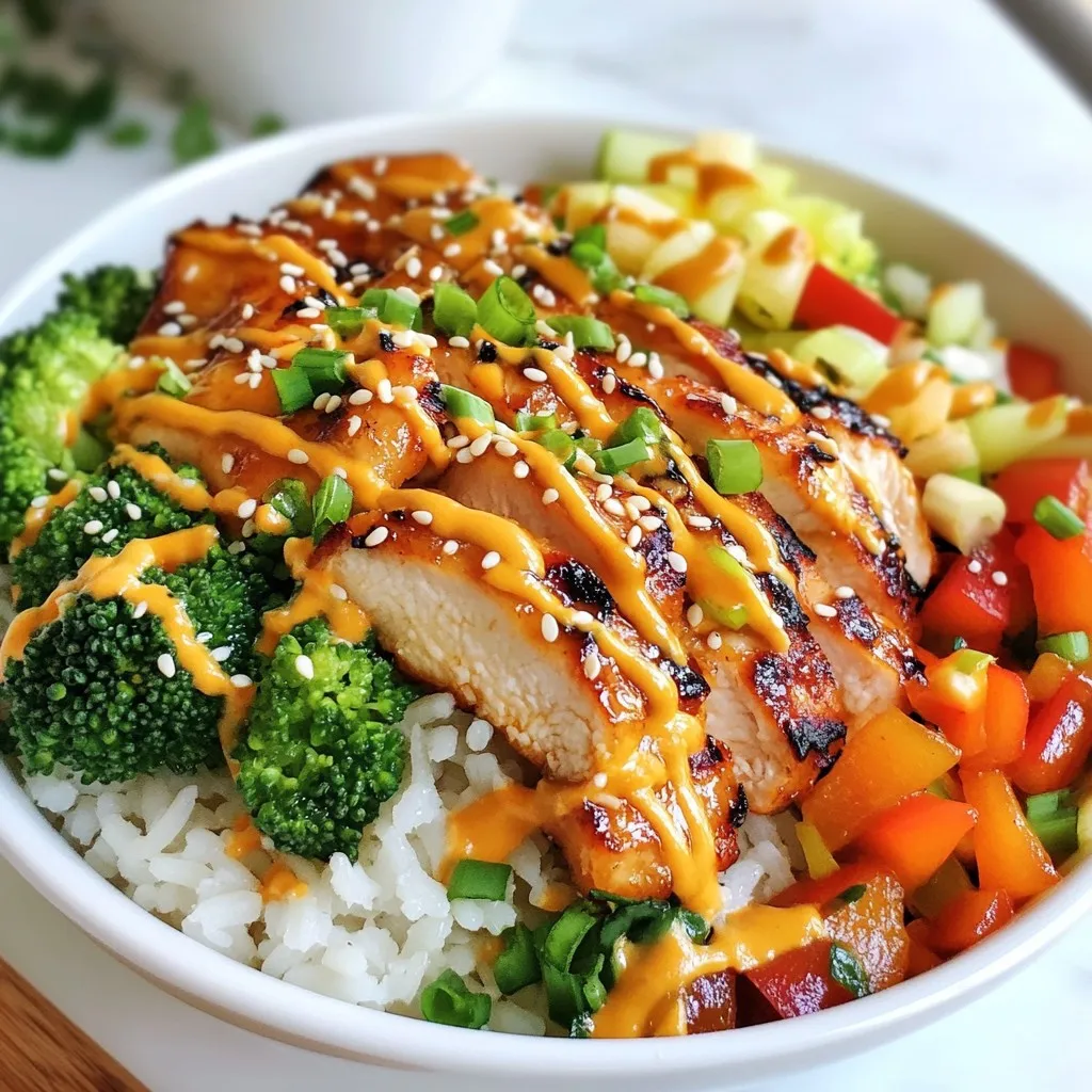 To make the Bang Bang Chicken Bowl, you will need: - 2 boneless, skinless chicken breasts - 1 cup jasmine rice, cooked - 1 cup broccoli florets, fresh - 1 carrot, julienned - 1 red bell pepper, thinly sliced - 1/4 cup mayonnaise - 2 tablespoons sweet chili sauce - 1 tablespoon Sriracha - 1 tablespoon soy sauce - 1 teaspoon garlic powder - 1 teaspoon ground ginger - Salt and freshly ground black pepper to taste You will need these tools for cooking: - Mixing bowl for marinating - Small pot for steaming - Non-stick skillet for cooking - Knife for slicing - Cutting board - Measuring cups and spoons For extra flavor and a nice look, consider these garnishes: - Sesame seeds - Green onions, thinly sliced {{ingredient_image_2}} Start by mixing garlic powder, ground ginger, soy sauce, salt, and pepper in a bowl. Coat the chicken breasts well in this mix. Let them sit for at least 15 minutes. This step makes the chicken flavorful and juicy. While the chicken marinates, boil water in a small pot. Steam the broccoli florets for about 3-4 minutes. They should be bright green and slightly tender. Set them aside and get ready for the next step. In a small bowl, combine mayonnaise, sweet chili sauce, and Sriracha. Stir this mixture until it’s smooth and creamy. You can adjust the Sriracha for more or less heat. This sauce adds a delightful kick to the bowl. Heat a non-stick skillet on medium-high heat. Add a little oil to the pan. When it's hot, add the marinated chicken. Cook for 5-7 minutes on each side. The chicken should be golden brown and reach an internal temperature of 165°F. Let it rest for a few minutes, then slice it into bite-sized pieces. Using the same skillet, add sliced red bell pepper and julienned carrot. Sauté for about 2-3 minutes. Stir often until the veggies are tender but still have a crunch. This adds color and texture to your bowl. Start with a scoop of cooked jasmine rice in each bowl. Layer on the steamed broccoli, sautéed bell pepper, and carrot. Now, place the sliced chicken on top. Make it look inviting and colorful. Drizzle a good amount of the bang bang sauce over the bowls. Sprinkle sesame seeds on top. Finish with sliced green onions for a fresh look. These details make your dish pop and taste even better. To make your Bang Bang Chicken Bowl just right, you can change the heat level. Sriracha gives a nice kick. You can add more if you like it hot. If you prefer less heat, use less Sriracha. Taste the sauce before you pour it on your dish. This way, you can make it perfect for your taste. Marinating the chicken is key for great flavor. I suggest at least 15 minutes. This allows the spices to soak into the chicken. If you have more time, marinate it for up to 2 hours in the fridge. Just remember to keep it covered. This extra time makes the chicken even tastier. For perfectly cooked chicken, heat your skillet well before adding the chicken. This helps to sear the meat and lock in juices. Cook each side for about 5-7 minutes. You want a nice golden color outside. Always check the inside; it should reach 165°F. Let it rest before slicing. This keeps it juicy and delicious! Pro Tips Marinate Longer for Flavor: For even more robust flavor, consider marinating the chicken for 30 minutes to an hour. This allows the spices to penetrate deeper into the meat. Customize Your Veggies: Feel free to substitute or add any vegetables you love! Snap peas, zucchini, or bok choy can be great alternatives that add different textures and flavors. Control the Heat: Adjust the amount of Sriracha in the bang bang sauce to suit your personal heat preference. Start with less, and add more until you reach your ideal spice level. Perfect Rice Every Time: To achieve fluffy jasmine rice, rinse it under cold water until the water runs clear before cooking. This removes excess starch and prevents it from becoming sticky. {{image_4}} You can swap chicken for several other proteins. Try shrimp for a quick cook option. Tofu brings a great texture when pressed and marinated. You can also use beef or pork for a heartier meal. Just adjust the cooking time to ensure everything cooks evenly. For a vegan twist, skip the chicken and use chickpeas or tempeh. Both add protein and flavor. Marinate the chickpeas just like the chicken. For tempeh, steam it first to soften before marinating. Use vegan mayo in the sauce for a creamy finish that everyone will love. Feel free to mix in various vegetables. Snap peas, zucchini, and bell peppers work well. You can also add corn for sweetness. Just remember to steam or sauté them until tender. The more colorful your bowl, the more fun it will be to eat! To keep your Bang Bang Chicken Bowl fresh, store it properly. Use airtight containers for leftovers. Place the chicken, rice, and veggies in separate containers. This prevents sogginess. Let everything cool to room temperature before sealing. Refrigerate within two hours of cooking. If you want to freeze it, use freezer-safe bags. Squeeze out as much air as you can. Reheating your bowl is simple. For best results, use the microwave. Place the food in a microwave-safe bowl. Add a splash of water to keep moisture. Heat on medium for 1-2 minutes. Stir halfway through to ensure even heating. You can also reheat on the stove. Just add a little oil to a pan and stir until warm. You can keep your Bang Bang Chicken Bowl in the fridge for 3-4 days. If you freeze it, the shelf life extends to 2-3 months. However, for the best flavor, eat it within the first month. Always check for signs of spoilage before eating leftovers. If it smells off or looks strange, it's better to toss it out. Bang Bang Sauce is a creamy, spicy blend. It combines mayonnaise, sweet chili sauce, and Sriracha. This sauce adds a kick to the dish. You can adjust the heat by changing the amount of Sriracha. The sauce's sweetness balances the spiciness well, making it a favorite. Yes, you can prepare parts of this dish ahead. Marinate the chicken a day before.