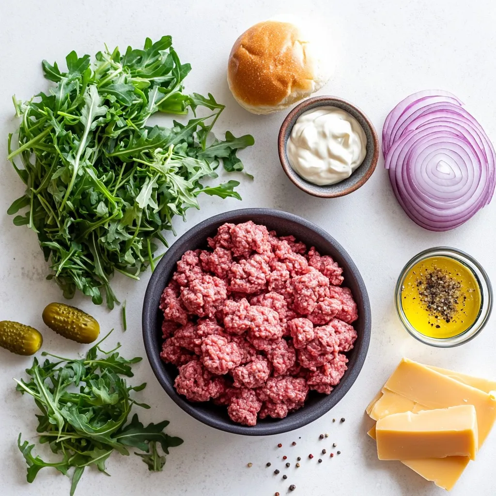 Now, take the bottom half of each toasted bun. Spread a thin layer of mayonnaise on it. Place a cheesy beef patty on top. Then, add a few slices of fresh red onion and a handful of arugula or baby spinach for color and flavor. If you like some crunch or heat, add pickles or jalapeños. Finally, top with the other half of the bun.