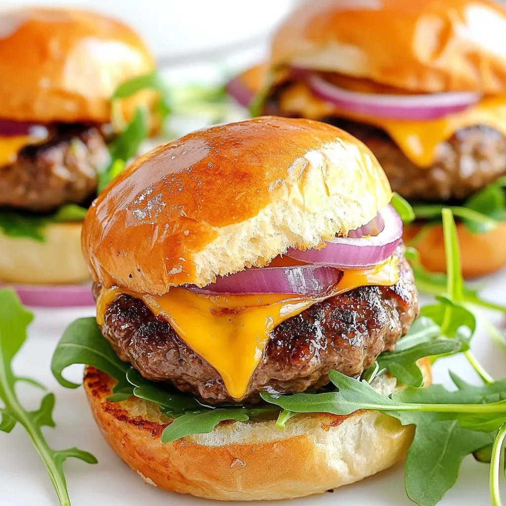 To make delicious beef and cheddar sliders, gather these ingredients: - 1 lb ground beef (80/20) - 1 teaspoon garlic powder - 1 teaspoon onion powder - 1 teaspoon smoked paprika - Salt and pepper to taste - 8 mini slider buns - 8 slices sharp cheddar cheese - 1 tablespoon Worcestershire sauce - 1 tablespoon olive oil - 1 small red onion, thinly sliced - 1 cup arugula or baby spinach - 2 tablespoons mayonnaise - Optional: pickles or jalapeños for topping You can swap ingredients based on what you have: - Use ground turkey or chicken for a lighter option. - Swap sharp cheddar for another cheese like Swiss or pepper jack. - If you don’t have Worcestershire sauce, soy sauce works too. - Use any greens you like instead of arugula or spinach. - Make sliders with gluten-free buns if needed. Add extra flavor with these toppings: - Slices of pickles for crunch. - Jalapeños for heat. - Sliced tomatoes for freshness. - A dollop of your favorite barbecue sauce. - Crispy bacon for a savory twist. These options let you customize the sliders to your taste. Enjoy mixing and matching! {{ingredient_image_2}} Start by getting a large mixing bowl. Add 1 pound of ground beef to the bowl. Sprinkle in 1 teaspoon of garlic powder, 1 teaspoon of onion powder, and 1 teaspoon of smoked paprika. Then, add salt and pepper to taste. Next, pour in 1 tablespoon of Worcestershire sauce. Mix everything gently with your hands or a spatula. Be careful not to overmix the meat, as this can make it tough. Divide the mixture into 8 equal parts. Shape each part into mini patties. Make them a bit larger than your slider buns because they will shrink while cooking. Heat 1 tablespoon of olive oil in a large skillet over medium-high heat. When the oil is hot and shimmering, carefully lay the patties in the skillet. Cook each side for about 3-4 minutes. You want a nice sear on them. If you want to check if they are done, use a meat thermometer. Aim for 160°F for medium well. In the last minute of cooking, place a slice of sharp cheddar cheese on each patty. Cover the skillet with a lid right away. This will trap heat and help the cheese melt nicely. While the patties are cooking, get your slider buns ready. Lightly toast them in a separate skillet or under a broiler. You want them golden brown and slightly crisp. This helps to keep them from getting soggy. Now, take the bottom half of each toasted bun. Spread a thin layer of mayonnaise on it. Place a cheesy beef patty on top. Then, add a few slices of fresh red onion and a handful of arugula or baby spinach for color and flavor. If you like some crunch or heat, add pickles or jalapeños. Finally, top with the other half of the bun. Serve your sliders right away while they are warm and gooey. Enjoy your savory beef and cheddar bites! To get a great burger texture, don’t overmix the meat. Mix just until the spices blend in. Use ground beef with 20% fat for juiciness. When shaping patties, make them slightly larger than the buns. This helps them stay juicy as they cook. The skillet method works best for sliders. Heat olive oil in a pan over medium-high heat. This gives the sliders a nice sear. Cook each side for 3-4 minutes. If you want grill marks, try cooking them on a grill. Just ensure the grill is hot before adding the patties. To melt cheese perfectly, place it on the patties during the last minute of cooking. Cover the pan with a lid right after adding the cheese. This traps heat and helps the cheese melt evenly. For extra flavor, use sharp cheddar or even mix in some pepper jack for a kick. Pro Tips Use Fresh Ingredients: Always opt for fresh ground beef and vegetables to enhance the flavor and texture of your sliders. Don’t Overcook the Patties: Remove the patties from the heat when they are slightly undercooked, as they will continue to cook from residual heat. Experiment with Toppings: Feel free to customize your sliders with unique toppings like avocado, crispy bacon, or different cheese varieties for added flavor. Keep It Simple: Sometimes less is more! Stick to a few quality ingredients to let the beef and cheese shine through. {{image_4}} You can switch the beef for other meats. Ground turkey or chicken works well. Both meats cook fast and stay juicy. Just remember to adjust the seasonings. Turkey needs more flavor, so add extra garlic or herbs. Chicken may need more salt. If you want a meatless option, try using black beans or lentils. Mash cooked beans with spices to form patties. You can also use store-bought veggie burgers. They are quick and easy. Just cook as you would the beef patties. Add lots of toppings like avocado or roasted peppers for extra taste. Change up the flavors to keep things exciting. For spicy sliders, add diced jalapeños or hot sauce to the beef mix. For a smoky taste, use smoked cheese or add extra smoked paprika. You can even mix in barbecue sauce for a sweet twist. Don't be afraid to experiment and find your favorite combo! To store leftover sliders, first let them cool down. Place them in an airtight container. Use parchment paper between layers to keep them fresh. You can also wrap each slider in plastic wrap. Keep them in the fridge for up to three days. This way, they stay tasty and safe to eat. For reheating, use the oven for great taste. Preheat your oven to 350°F. Place the sliders on a baking sheet. Cover them with aluminum foil to keep moisture in. Heat for about 10-15 minutes. This method helps keep the buns soft and the cheese melty. You can also use a microwave if you're in a hurry. Just heat for 30 seconds at a time until warm. You can freeze sliders for a quick meal later. Wrap each slider tightly in plastic wrap. Then place them in a freezer bag. Remove as much air as possible before sealing. Label the bag with the date. Sliders can last up to three months in the freezer. To enjoy, thaw them in the fridge overnight. Reheat them in the oven for the best flavor. Yes, you can make Beef & Cheddar Sliders ahead of time. Yo