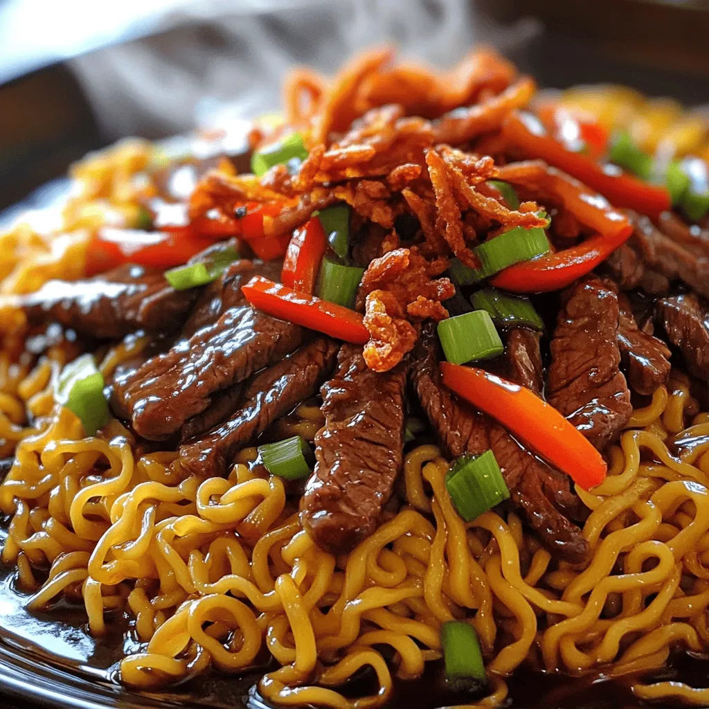 These ingredients create a mix of flavors and textures. The egg noodles give a soft base. Flank steak adds heartiness. Soy sauce and hoisin sauce bring rich umami. Brown sugar balances the saltiness. Sesame oil adds warmth, while garlic and ginger provide a fragrant kick. Red bell pepper and green onions add color and crunch. Cornstarch helps the beef stay tender. Using fresh ingredients makes all the difference. You’ll taste the care in each bite!