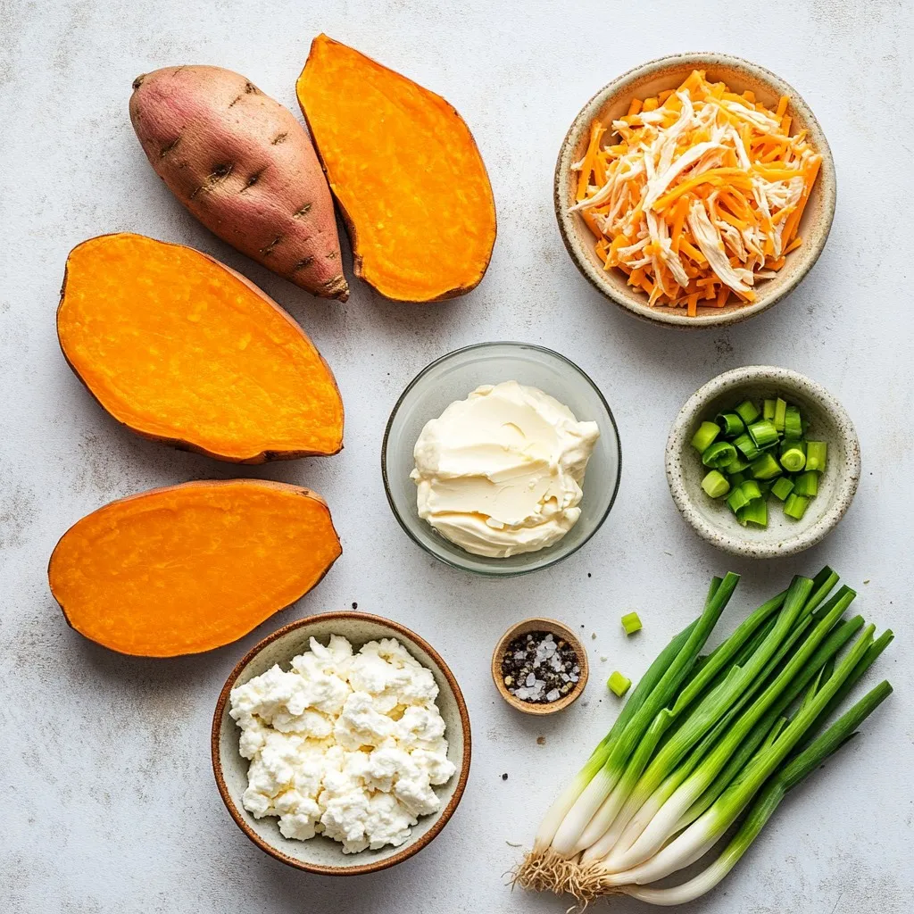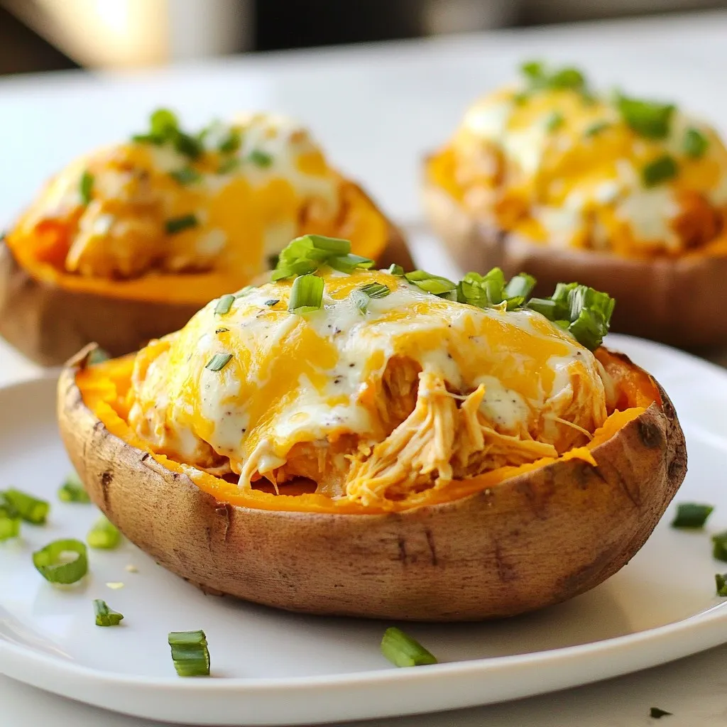 - 4 medium sweet potatoes - 2 cups shredded cooked chicken - ½ cup buffalo sauce - ½ cup cream cheese, softened - ½ cup shredded cheddar cheese - 3 green onions, finely chopped - Salt and pepper to taste - 2 tablespoons olive oil - Optional toppings: blue cheese crumbles, additional chopped green onions, ranch dressing If you want to change things up, try these ideas: - Use rotisserie chicken for quick prep. - Swap cream cheese with Greek yogurt for a lighter touch. - Replace cheddar cheese with mozzarella for a milder flavor. - Try different hot sauces if you want a unique kick. Here are some handy conversions: - ½ cup = 120 milliliters - 2 tablespoons = 30 milliliters - 4 medium sweet potatoes = about 1.5 pounds - 1 cup shredded chicken = about 150 grams These ingredients will help you create a tasty dish. Feel free to experiment with alternatives to match your taste. Enjoy cooking! {{ingredient_image_2}} Start by preheating your oven to 400°F (200°C). This step warms the oven for baking. Rinse each sweet potato under cold water. This removes dirt and grit. Use a fork to poke holes in the potatoes. Doing this lets steam escape while they cook. Next, coat the sweet potatoes with olive oil. Sprinkle them with salt. This adds flavor. Place them on a baking sheet and put them in the oven. Bake for about 45-60 minutes. They are ready when a fork easily pierces them. While the sweet potatoes bake, it's time to make the filling. In a mixing bowl, combine the shredded cooked chicken and buffalo sauce. Stir them together until the chicken is well coated. This gives your filling a spicy kick. Now, add the softened cream cheese. Mix it in well to create a creamy texture. If you want more heat, add extra buffalo sauce. It’s all about your taste. Once the sweet potatoes are tender, take them out of the oven. Let them cool for 5-10 minutes. Slice each potato in half lengthwise. Carefully scoop some flesh out to create a well for the filling. You can mix this scooped flesh into the chicken filling for added creaminess. Next, fill each sweet potato half with the buffalo chicken mixture. Pack it in well to ensure every bite is flavorful. Top each potato with shredded cheddar cheese. Now, return the stuffed sweet potatoes to the oven. Bake them for another 10-15 minutes. You want the cheese to melt and bubble. After baking, let them sit for a minute. Garnish with chopped green onions. You can also add optional toppings like blue cheese or ranch dressing. These give an extra burst of flavor. Enjoy your delicious Buffalo Chicken Stuffed Sweet Potatoes! To get sweet potatoes just right, choose medium-sized ones. They cook evenly and hold their shape. Always rinse them well to remove dirt. Poking holes with a fork lets steam escape. Coat them with olive oil and salt for flavor. Bake until tender, around 45-60 minutes. Test by poking them with a fork. If they are soft all the way through, they are ready! Buffalo sauce has varying heat levels. You can adjust the spiciness to fit your taste. Start with a half cup of buffalo sauce. Mix it into the chicken well. If you like more heat, add an extra tablespoon or two. You can also add some cayenne pepper for a kick. Don't forget to taste the mixture as you go! When serving, presentation matters. Place the stuffed sweet potatoes on a large platter. Drizzle some extra buffalo sauce around the edge for flair. A sprinkle of fresh green onions on top adds color. You can also add blue cheese crumbles for a rich taste. This makes the dish look amazing and appetizing! Pro Tips Adjust the Spice Level: If you prefer a milder flavor, reduce the amount of buffalo sauce or use a milder variety. Always taste as you go to find your perfect balance. Enhance Creaminess: For an even creamier filling, consider adding a dollop of sour cream or Greek yogurt along with the cream cheese. This will add a tangy flavor and smooth texture. Perfectly Baked Sweet Potatoes: To ensure even cooking, choose sweet potatoes that are similar in size. This will help them bake uniformly in the oven. Fun Toppings: Get creative with toppings! Besides green onions and blue cheese, try adding jalapeños, diced tomatoes, or avocado for an extra burst of flavor and texture. {{image_4}} You can make a tasty vegetarian version of buffalo chicken stuffed sweet potatoes. Instead of chicken, use shredded cauliflower or chickpeas. Both options provide a hearty base. Mix them with buffalo sauce and cream cheese for a creamy filling. You can also add black beans for extra protein. Top with shredded cheese and bake just like the original recipe. This version keeps the bold flavors while being meat-free. For a low-carb twist, swap out the sweet potatoes for zucchini boats or bell peppers. Cut them in half and scoop out the insides. Then, fill them with the buffalo chicken mix. Bake until tender. You still get that delicious buffalo flavor, but with fewer carbs. This way, you can enjoy a lighter meal without missing out on taste. Feel free to experiment with different sauces. Try barbecue sauce for a sweeter taste or garlic sauce for a zing. You can also switch up the cheese. Use mozzarella for a milder flavor or pepper jack for extra spice. Mix and match until you find your perfect combo. These changes keep the dish fresh and fun with every bite. After enjoying your Buffalo Chicken Stuffed Sweet Potatoes, you may have some leftovers. To store them, let the sweet potatoes cool to room temperature. Then, wrap each one tightly in plastic wrap or place them in an airtight container. These can last in the fridge for up to three days. Keeping them sealed will help preserve their flavor and moisture. When you're ready to enjoy your leftovers, reheating is simple. Preheat your oven to 350°F (175°C). Place the stuffed sweet potatoes on a baking sheet. Cover them with foil to keep them moist. Heat for about 15-20 minutes or until warmed through. If you're in a hurry, you can use the microwave. Place a potato on a mic