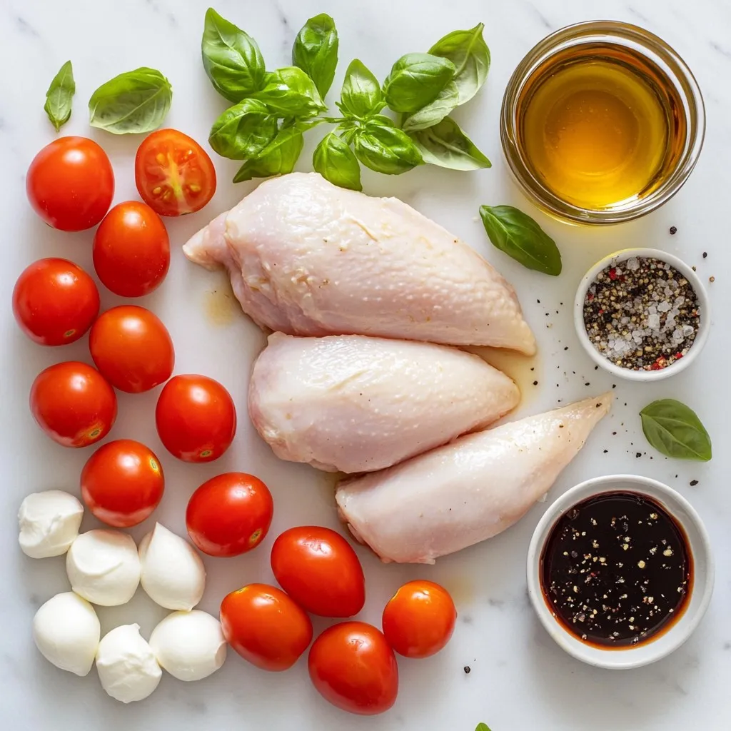 For this Caprese stuffed chicken recipe, you need two large chicken breasts. They should be thick enough to hold a good amount of filling. The Caprese filling requires fresh and vibrant ingredients. Cherry tomatoes add sweetness and color. Fresh mozzarella provides creaminess and melts beautifully. The basil brings in a fragrant touch. Minced garlic adds depth to the flavor.