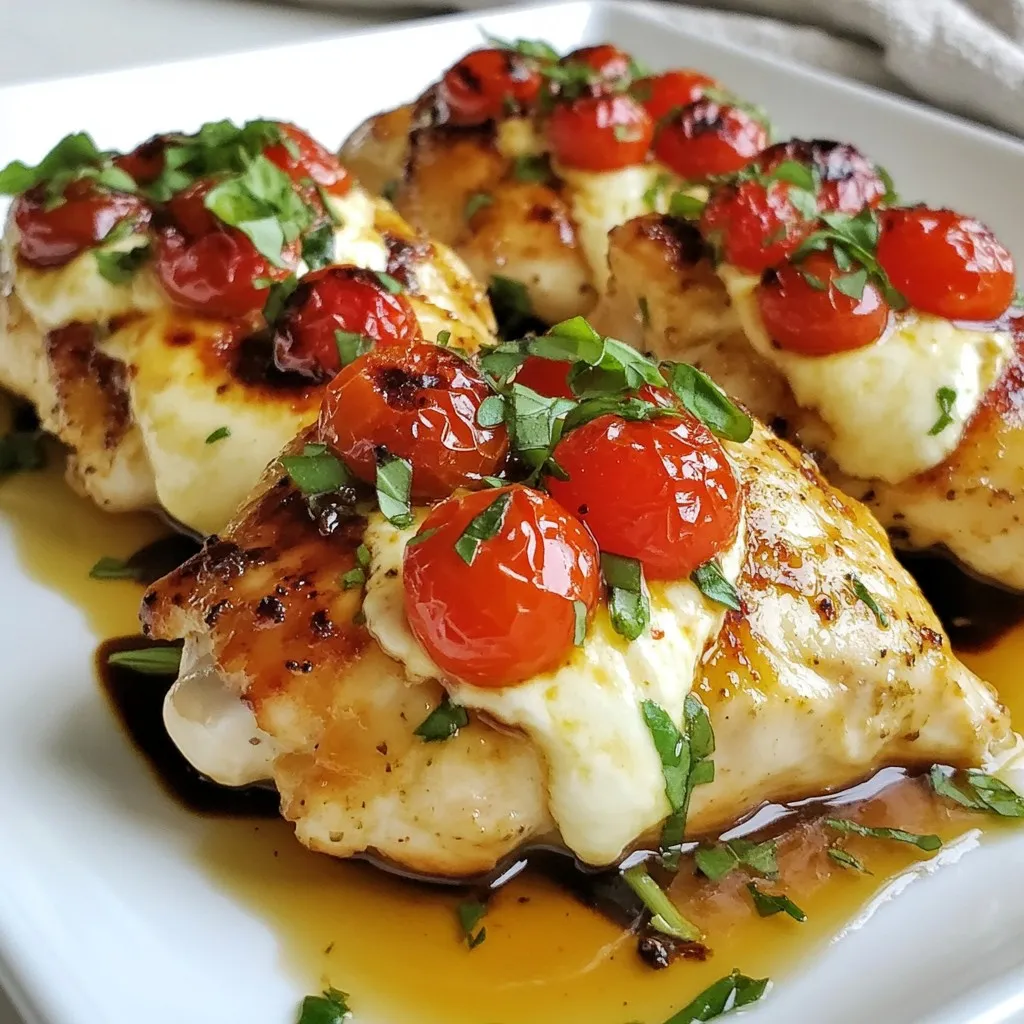 A delicious chicken breast stuffed with fresh mozzarella, cherry tomatoes, basil, and garlic, drizzled with balsamic glaze.