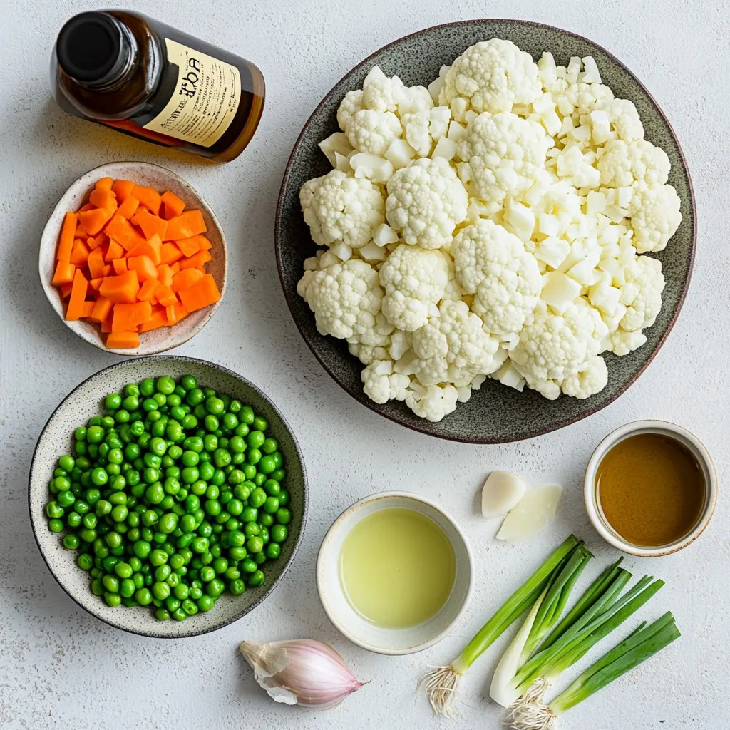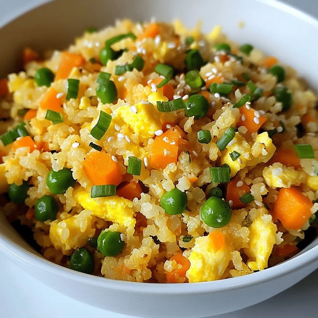 To make this tasty dish, you need a few key ingredients: - 1 large head of cauliflower, riced or grated - 2 tablespoons olive oil - 3 cloves garlic, finely minced - 1 small onion, finely diced - 1 medium carrot, diced - 1 cup frozen peas - 2 large eggs, lightly beaten - 3 tablespoons low-sodium soy sauce - 2 green onions, thinly sliced - Salt and freshly ground black pepper, to taste - 1 tablespoon sesame oil These ingredients work together to create a colorful and tasty meal. The cauliflower serves as the base, giving you that rice-like texture. You can spice things up with some optional ingredients: - Sriracha or chili flakes for added heat These extras give your dish a nice kick. You can adjust the amount based on your taste. Each ingredient in this recipe offers great nutrition: - Cauliflower: Low in calories and high in fiber, it helps with digestion. - Olive oil: Packed with healthy fats that support heart health. - Garlic: Known for its immune-boosting properties and rich flavor. - Onion: Adds taste and provides vitamins that help your body. - Carrot: Full of beta-carotene, which is good for your eyes. - Peas: A great source of plant protein and fiber, making you feel full. - Eggs: Rich in protein and nutrients, they help build muscles. - Soy sauce: Adds flavor with lower sodium options for health. - Green onions: Provide vitamins and add freshness. - Sesame oil: Gives a nutty flavor and contains antioxidants. Using fresh, high-quality ingredients makes this dish not only healthy but also full of flavor. {{ingredient_image_2}} Start by taking a large head of cauliflower. Remove the green leaves and stem. You want just the white part. Next, grate the cauliflower or pulse it in a food processor. You want it to look like rice grains. Once done, set it aside in a bowl. This step is key because fresh cauliflower gives the best texture. In a large skillet or wok, heat two tablespoons of olive oil over medium heat. Once the oil is hot, add three cloves of minced garlic and one small diced onion. Sauté them for about three to four minutes. You want the onion to become translucent and fragrant. This adds a great base flavor. After that, add one medium diced carrot. Cook it for another two to three minutes, stirring often. This softens the carrot just right. Now, toss in one cup of frozen peas and stir to combine. Let them cook for about two minutes until they are heated through. The mix of colors will make your dish pop! Next, push the vegetables to one side of the skillet. Pour in two large beaten eggs in the clear space. Scramble the eggs until they are just set. Once cooked, mix the eggs into the vegetable blend. This adds protein and richness to your dish. Now, it’s time to add the riced cauliflower. Stir it well into the mix. Cook for five to seven minutes while stirring occasionally. You want the cauliflower to be tender but not mushy. Overcooking will ruin the texture. Drizzle three tablespoons of low-sodium soy sauce and one tablespoon of sesame oil over the cauliflower mix. Season with salt and freshly ground black pepper to taste. If you like heat, add Sriracha or chili flakes to your liking. This gives the dish a nice kick! Finally, stir in two sliced green onions. Remove the skillet from the heat. Your cauliflower fried rice is ready to serve! Enjoy the vibrant flavors and colors on your plate. To make the best cauliflower fried rice, follow these easy steps. You want to start by ricing your cauliflower. Use a food processor or box grater. This gives you a nice rice-like texture. Heat olive oil in a large skillet or wok. Cook garlic and onion until soft. This takes about 3 to 4 minutes. Their aroma fills the kitchen and sets the base for flavor. Next, add diced carrots and frozen peas. Stir them for another 2 minutes until they warm up. Push the veggies to one side of the pan. Pour in your beaten eggs. Scramble them until just set. Mix the eggs back into the veggie blend for even cooking. Finally, add your riced cauliflower, soy sauce, and sesame oil. Stir well for 5 to 7 minutes. To keep your cauliflower from getting mushy, don’t overcook it. Aim for tender but still firm cauliflower. When you add it to the skillet, monitor the heat closely. High heat helps to sauté without steaming. Also, make sure to rice the cauliflower well. Consistent size helps it cook evenly. If you find your cauliflower too wet, you can pat it dry with a paper towel before cooking. This small step helps keep the texture just right. For extra flavor, try adding some spices. A pinch of salt and black pepper goes a long way. If you like heat, Sriracha or chili flakes are great options. You can also add fresh herbs for brightness. Chopped cilantro or basil works well. Lastly, squeeze some lime juice before serving. It adds a lovely zing that brightens the dish. Enjoy experimenting with flavors to find your favorite! Pro Tips Use Fresh Cauliflower: Fresh cauliflower gives the best texture and flavor. Look for heads that are firm, with tightly packed florets and fresh green leaves. Don't Overcook the Cauliflower: Aim for a tender but slightly crunchy texture. Overcooking can lead to mushiness, losing the 'fried rice' feel. Customize Your Veggies: Feel free to add or substitute other vegetables like bell peppers, zucchini, or mushrooms to suit your taste and make it more colorful. Make it a Meal: To make this dish more filling, consider adding cooked chicken, shrimp, or tofu for additional protein. {{image_4}} You can easily add protein to cauliflower fried rice. Chicken, shrimp, or tofu all work well. For chicken, use cooked, diced breast. For shrimp, use cooked shrimp or sauté fresh shrimp until they turn pink. For tofu, press it to remove excess water, then cube it. Add your chosen protein when you cook the vegetables. This step allows it to heat through and blend with the flavors. Making cauliflower fried rice vegetarian or vegan is simple. Just skip the eggs, and use tofu or chickpeas for protein.