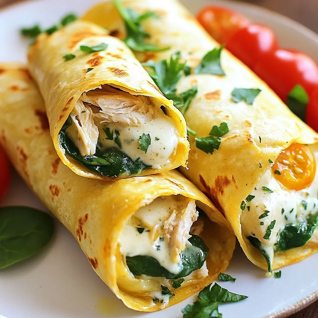 - 2 cups cooked chicken, shredded - 1 cup cream cheese, softened to room temperature - 1 cup shredded mozzarella cheese - 2 cloves garlic, finely minced - 1 tablespoon fresh parsley, chopped - 1 teaspoon smoked paprika - Salt and black pepper to taste - 4 large tortillas (flour or whole wheat) - 1 cup baby spinach leaves, washed and dried - 1/2 cup cherry tomatoes, quartered - Olive oil for cooking For these Cheesy Garlic Chicken Wraps, you need a few simple ingredients. The chicken and cheese filling is the star of the dish. Shredded chicken gives it a hearty base. Cream cheese adds richness, while mozzarella brings that gooey goodness. Next, we add garlic, fresh parsley, and smoked paprika. Garlic gives a bold flavor. Parsley adds a fresh touch, and smoked paprika offers warmth without heat. Don’t forget salt and pepper for balance. The tortillas hold everything together. You can use flour or whole wheat. Both work well. Fresh ingredients like baby spinach and cherry tomatoes add color and crunch. They make the wraps bright and tasty. When you gather all these ingredients, you are set for a fun cooking adventure! {{ingredient_image_2}} To make the filling, start by gathering your ingredients. In a mixing bowl, combine: - 2 cups cooked chicken, shredded - 1 cup cream cheese, softened - 1 cup shredded mozzarella cheese - 2 cloves garlic, finely minced - 1 tablespoon fresh parsley, chopped - 1 teaspoon smoked paprika - Salt and black pepper to taste Mix all these ingredients well using a spatula. You want a smooth and creamy filling that bursts with flavor. Next, it's time to prepare the wraps. Lay your tortillas flat on a clean surface. Divide the cheesy chicken mixture evenly among the tortillas. Spread it in the center, leaving about an inch of space at the edges. On top of the filling, add: - 1 cup baby spinach leaves, washed and dried - 1/2 cup cherry tomatoes, quartered This adds a nice crunch and fresh taste. Now, carefully fold the sides of each tortilla inward. Then roll the bottom edge up over the filling. Tuck it in to secure everything. Keep rolling until you reach the top edge. To cook the wraps, heat a skillet over medium heat and add a drizzle of olive oil. Once hot, place the wraps seam-side down in the skillet. Cook for about 3-4 minutes until they turn golden brown and crispy. Using tongs, gently flip the wraps to cook the other side for another 3-4 minutes. The cheese should melt, and the tortillas should be golden. Once cooked, take them out and let them cool for a minute. Then slice each wrap in half diagonally for easy serving. To get the best crispy wraps, use medium heat. Heat your skillet and add olive oil. This method helps the tortillas turn golden brown. Avoid using high heat, as it might burn them. A nice crisp gives the wraps a great texture. You can make these wraps your own! Add jalapeños for spice or bell peppers for crunch. You can also toss in some olives or mushrooms. Mix and match your favorite veggies. This way, you can change the flavor and keep it fun. These wraps taste great with dips! Serve them with marinara sauce or salsa. You can also add a side salad for freshness. Pairing these wraps with a simple salad makes your meal complete. The flavors and textures work well together, making it even more enjoyable. Pro Tips Choose the Right Tortilla: Opt for flour tortillas for a softer wrap or whole wheat for a nuttier flavor. Both options work well with the cheesy filling. Customize Your Fillings: Feel free to add other vegetables like bell peppers or onions for extra flavor and nutrition. You can also swap the chicken for shredded turkey or a plant-based alternative. Ensure Even Cooking: Make sure your skillet is adequately heated before adding the wraps to achieve that perfect crispy exterior. Avoid overcrowding the pan to allow for even cooking. Dip and Enjoy: Serve with your favorite dipping sauce, such as marinara or ranch, to enhance the flavors and add a fun element to your meal. {{image_4}} If you need a gluten-free option, use gluten-free tortillas. They work just as well. For a dairy-free version, swap the cream cheese with a vegan cream cheese. You can also use dairy-free mozzarella cheese. This way, everyone can enjoy these wraps! You can play with flavors by changing cheeses. Try gouda, cheddar, or feta. Each cheese adds a new taste. Adding fresh herbs like basil or cilantro can also change the flavor. If you like heat, add red pepper flakes or chili powder. These small changes can make your wraps exciting and tasty. Want to boost nutrition? Add black beans for protein and fiber. They also add a nice texture. Sliced avocado brings creaminess and healthy fats. You can also try roasted red peppers or corn. These extras make your wraps more colorful and interesting! To keep your cheesy garlic chicken wraps fresh, store any leftovers in an airtight container. This method helps maintain their taste and texture. You can enjoy them for up to three days. Just make sure they cool down before sealing the container. You can freeze these wraps either before or after cooking. If you freeze them before cooking, wrap each one tightly in plastic wrap, then place them in a freezer bag. This helps keep them safe from freezer burn. They can last up to three months. If you freeze cooked wraps, let them cool completely first. Then, store them in an airtight container or freezer bag. They are best used within two months for optimal flavor. To reheat your wraps, the skillet is the best choice. Heat a bit of olive oil over medium heat. Place the wraps seam-side down in the skillet. Cook for about three to four minutes on each side. This keeps them crispy and warms the cheese inside. You can also use an oven. Preheat it to 350°F (175°C) and place the wraps on a baking sheet. Heat for about 10 minutes. This method helps keep them crunchy, too! Yes, you can use rotisserie chicken. It saves time and effort. Rotisserie chicken is already cooked and flavorful. Thi