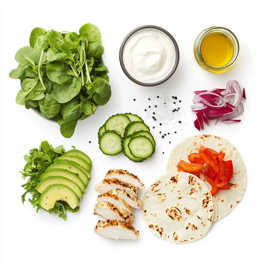Next, I place a whole wheat tortilla flat on my clean counter. I use a spoon to spread a generous dollop of the creamy dressing right in the center. Then, I layer on mixed greens, followed by the grilled chicken slices. I add the ripe avocado slices, cucumber, red bell pepper, and red onion on top. Sometimes, I drizzle a little more dressing for extra flavor. Each layer adds color and crunch.