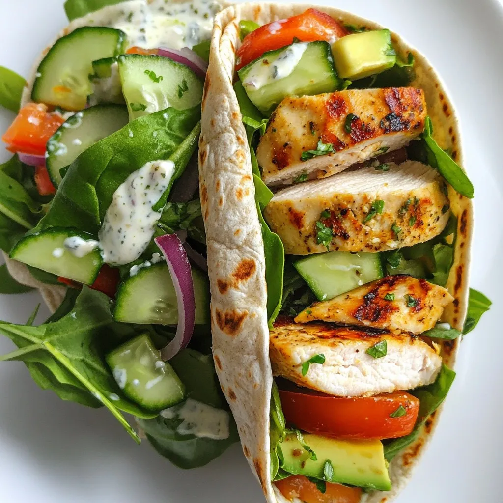 Delicious wraps filled with grilled chicken, fresh avocado, and mixed greens, drizzled with a creamy dressing.