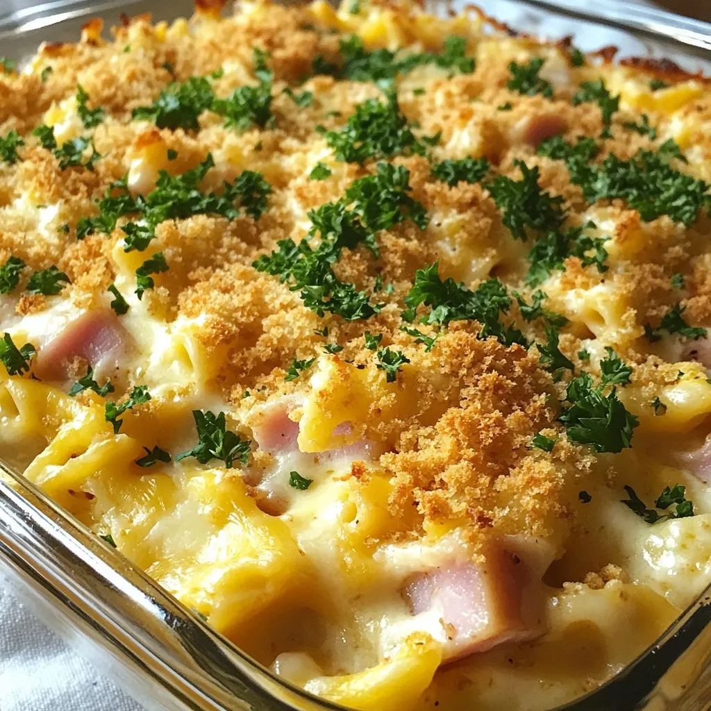 A delicious and comforting casserole featuring shredded chicken, ham, and Swiss cheese, topped with breadcrumbs for a crunchy finish.