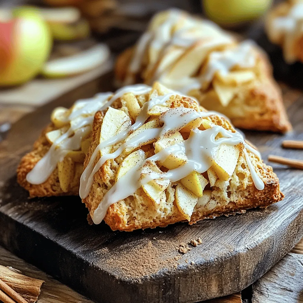 - 2 cups all-purpose flour - 1/3 cup granulated sugar - 1 tablespoon baking powder - 1 teaspoon ground cinnamon - 1/2 teaspoon salt - 1/2 cup unsalted butter, cold and cut into small cubes - 1 large apple, peeled and diced (about 1 cup) - 1/2 cup heavy cream - 1 large egg - 1 teaspoon pure vanilla extract - 1 cup powdered sugar - 1 tablespoon milk - 1 teaspoon pure vanilla extract You can swap some ingredients for great results. Use whole wheat flour instead of all-purpose flour for a nutty flavor. If you want less sugar, try using maple syrup. You can replace heavy cream with almond milk or coconut cream for a lighter option. For a different spice, you might use nutmeg instead of cinnamon. Get creative and make this recipe your own! First, set your oven to 400°F (200°C). This will help your scones bake evenly. Next, line a baking sheet with parchment paper. This step stops the scones from sticking. In a large bowl, whisk together the following dry items: - 2 cups all-purpose flour - 1/3 cup granulated sugar - 1 tablespoon baking powder - 1 teaspoon ground cinnamon - 1/2 teaspoon salt Mix these well. This ensures the flavors are balanced in every bite. Now, add 1/2 cup of cold, cubed butter. You can use your fingers or a pastry cutter to blend it in. Mix until the mixture looks crumbly. It should resemble coarse sand or small peas. This step adds richness to your scones. Next, take 1 large apple, peeled and diced. Gently fold in the apple pieces. Make sure they are well mixed in without breaking apart. These apples add a fresh, sweet burst in each scone. In a small bowl, whisk together: - 1/2 cup heavy cream - 1 large egg - 1 teaspoon pure vanilla extract This mixture adds moisture and flavor to your dough. Pour the wet mixture into the dry ingredients. Stir gently until just combined. Be careful not to overmix. Transfer the dough to a floured surface. Shape it into a round disc about 1 inch thick. Cut the disc into 8 wedges, like slicing a pizza. Move them carefully to the prepared baking sheet. Place the baking sheet in the preheated oven. Bake for 15-20 minutes. You want them to turn golden brown. Check with a toothpick; it should come out clean when they are done. While the scones bake, prepare the glaze. In a small bowl, mix: - 1 cup powdered sugar - 1 tablespoon milk - 1 teaspoon pure vanilla extract Stir until smooth. Adjust the thickness by adding more milk or sugar as needed. After baking, cool the scones for about 10 minutes on a wire rack. Drizzle the vanilla glaze over the warm scones. For a nice touch, sprinkle a pinch of cinnamon and add thin apple slices for decoration. Now, you have a beautiful treat to enjoy! To make fluffy scones, focus on how you mix. Start by whisking dry ingredients well. This helps the baking powder spread evenly. When you add butter, use a pastry cutter or your fingers. Aim for a crumbly texture, not a smooth dough. Gently fold in apples to keep them intact. Overmixing can make scones tough, so stir just until combined. If you have leftover scones, store them in an airtight container. This keeps them fresh for a couple of days. You can also wrap them in plastic wrap and place them in the fridge. For longer storage, freeze them. Just make sure they are completely cool before wrapping. When you want to enjoy them again, thaw at room temperature. Serve scones warm for the best taste. They taste best right out of the oven, but you can also enjoy them later. If you want to serve them fresh, bake just before your guests arrive. If you prepare ahead, warm them in the oven for a few minutes. This will revive that lovely, fresh-baked taste. {{image_4}} You can easily change the flavor of your cinnamon apple scones. Adding nuts like walnuts or pecans gives a nice crunch. Chop them finely and mix them into the dough. You can also try spices like nutmeg or cardamom. Just a pinch adds a unique twist to the classic flavor. These small changes can make your scones exciting and new. If you're looking for a gluten-free option, use a gluten-free all-purpose flour blend. Make sure it has xanthan gum for the right texture. This swap allows everyone to enjoy these tasty scones. Follow the same steps in the recipe. You won't lose any flavor or fluffiness. It's a great way to include friends with dietary needs. For bite-sized treats, try making mini scones. Use half the dough and shape it into smaller discs. Cut each disc into smaller wedges. This way, you’ll have cute, small scones perfect for sharing. They bake quickly too, so keep an eye on them. Mini scones are fun for brunch or tea parties. To keep your scones fresh, place them in an airtight container. This helps retain moisture and flavor. You should store them at room temperature for up to two days. If you want to keep them longer, consider freezing. For long-term storage, freeze your scones after they cool. Wrap each scone in plastic wrap, then place them in a freezer bag. This method will keep them fresh for up to three months. When you're ready to enjoy them, just pull out the desired number. To reheat scones, preheat your oven to 350°F (175°C). Place the scones on a baking sheet. Heat for about 10-15 minutes until warm. You can also microwave them for 15-20 seconds. This will help keep their soft texture and delicious flavor. Yes, you can use any apple. I like to use Granny Smith for a tart flavor. Fuji or Honeycrisp work great too and add sweetness. Just make sure to peel and dice them for even cooking. The scones are done when they turn a golden brown. Insert a toothpick in the center. If it comes out clean, they are ready. Keep an eye on them during baking, usually around 15 to 20 minutes. Yes, you can make the dough ahead. Wrap it tightly in plastic wrap. Store it in the fridge for up to 24 hours. Just remember to bring it to room temperature before baking. You can use whole milk or half-and-half. Use 3/4 cup to replace 1/2 cup of heavy cream. If you want a non-dairy option, try coconut milk or almo