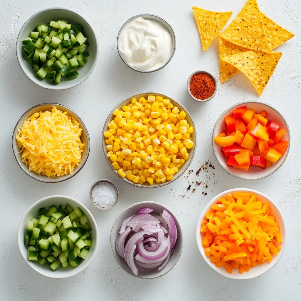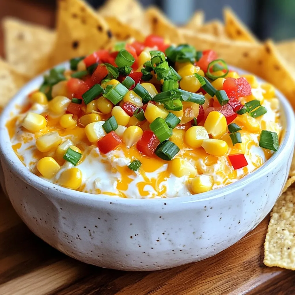A creamy and cheesy dip featuring sweet corn, cheddar cheese, and fresh vegetables, perfect for dipping.