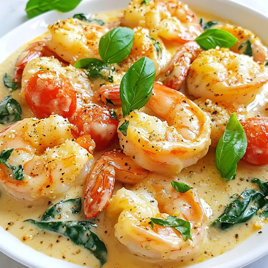 - 1 pound large shrimp, peeled and deveined - 2 tablespoons extra virgin olive oil - 3 cloves garlic, finely minced - 1 cup cherry tomatoes, halved - 1 cup heavy cream - 1/2 cup freshly grated Parmesan cheese - 1 teaspoon Italian seasoning blend - Salt and freshly ground black pepper, to taste - Fresh spinach leaves - Fresh basil leaves for garnish To make the Creamy Tuscan Shrimp Skillet, gather your main ingredients first. The shrimp should be large, peeled, and deveined. The olive oil adds a nice flavor during cooking, while minced garlic gives a rich aroma. Fresh cherry tomatoes bring sweetness and color to the dish. Next, focus on the creamy sauce. Heavy cream creates the base, and Parmesan cheese adds depth. The Italian seasoning blend gives a classic touch. Make sure to have salt and pepper on hand to season the dish perfectly. For garnish, fresh spinach leaves add a burst of green. They also add nutrients to the meal. Finally, fresh basil leaves will elevate the dish's look and taste. The bright green color looks stunning on the plate, and the flavor is refreshing. This combination of ingredients makes for a delightful meal. Each part plays a role in creating a rich, creamy, and flavorful dish that everyone will love. {{ingredient_image_2}} To start, heat 2 tablespoons of extra virgin olive oil in a large skillet over medium heat. Once the oil shimmers, add 1 pound of large shrimp, peeled and deveined. Make sure to season the shrimp with salt and freshly ground black pepper. Sauté the shrimp for about 2-3 minutes on each side. They should become pink and opaque. Once cooked, set the shrimp aside on a plate. In the same skillet, without cleaning it, add 3 cloves of finely minced garlic. Sauté for about 30 seconds. You want the garlic to be fragrant and golden, but not burnt. Next, add 1 cup of halved cherry tomatoes and 1 teaspoon of Italian seasoning. Stir and sauté for 2-3 minutes. This allows the tomatoes to soften and release their juices. Now, lower the stove temperature. Pour in 1 cup of heavy cream, stirring continuously. Let the mixture come to a gentle simmer. This step helps develop rich flavors. Gradually add 1/2 cup of freshly grated Parmesan cheese. Stir until it melts, transforming the sauce into a rich and creamy delight. Incorporate 1 cup of fresh spinach leaves into the sauce. Stir until they wilt. Then, return the cooked shrimp back to the skillet. Mix everything gently and let it cook for another 2 minutes to warm through. Taste the dish and adjust the seasoning with more salt and pepper if needed. Finally, remove the skillet from heat. Garnish with fresh basil leaves for a burst of color and flavor before serving. - To sauté shrimp well, keep the heat at medium. This cooks the shrimp evenly. - Dry the shrimp with a paper towel. This helps them sear better and adds flavor. - Season the shrimp with salt and pepper before cooking. This enhances their taste. - Avoid burning the garlic. Sauté it just until it turns golden and fragrant. - For a creamy texture, add the heavy cream slowly. Stir it to blend well. - Use fresh tomatoes and spinach for the best flavor. They make the dish bright and tasty. - Freshly grated Parmesan melts better than pre-grated cheese. It adds a rich taste. - Taste the sauce as you cook. Adjust the seasoning for a perfect balance. - Serve this dish over pasta for a filling meal. The sauce clings to the noodles nicely. - Crusty bread is great for soaking up the creamy sauce. It adds a nice crunch. - Garnish with fresh basil leaves for a pop of color. It also adds a lovely aroma. - A drizzle of extra olive oil on top can enhance the dish’s look and flavor. Pro Tips Fresh Shrimp: Whenever possible, use fresh shrimp for the best flavor and texture. Frozen shrimp can be a good alternative, but be sure to thaw them properly before cooking. Garlic Perfection: To prevent garlic from burning, always sauté it over medium heat and monitor closely. Burnt garlic can turn bitter and ruin the dish. Creme de la Creme: For a richer sauce, consider using mascarpone cheese along with Parmesan. It will elevate the creaminess and add a delightful flavor. Serve It Right: Pair this dish with a light white wine, such as Sauvignon Blanc, to complement the creamy flavors and enhance your dining experience. {{image_4}} You can switch up the shrimp for other seafood like scallops or fish. This gives you a fresh taste. If you want a lighter dish, use zucchini or mushrooms instead of shrimp. These veggies soak up the sauce well and add great flavor. To boost the flavor, try adding a pinch of red pepper flakes for heat. Fresh herbs like parsley or thyme can also make a big difference. For cheese options, use feta or mozzarella instead of Parmesan. Each cheese brings a unique taste to your dish. If you need a gluten-free meal, serve it over gluten-free pasta or rice. You can also use cornstarch as a thickener if needed. For a dairy-free version, swap the heavy cream for coconut milk and the cheese for a nut-based cheese. This keeps the dish creamy and rich without dairy. To store leftovers, let the dish cool first. Place it in an airtight container. The Creamy Tuscan Shrimp Skillet will stay fresh for 3 to 4 days in the fridge. Make sure to label your container with the date for easy tracking. You can freeze the Creamy Tuscan Shrimp Skillet if you want to save it for later. Portion it into freezer-safe containers. It can last for about 2 to 3 months in the freezer. To reheat, thaw it in the fridge overnight. Warm it on the stove over low heat. This helps keep the shrimp tender and the sauce creamy. Cooking in advance makes meals quick and easy. You can prepare the shrimp and sauce ahead of time. Store them separately for the best texture. Pair the dish with prepped sides like rice or steamed veggies. This way, you can enjoy a balanced meal without the fuss on busy nights. Shrimp cooks fast. Look for a pink color and a firm texture. When shrimp turns opaque, it's do