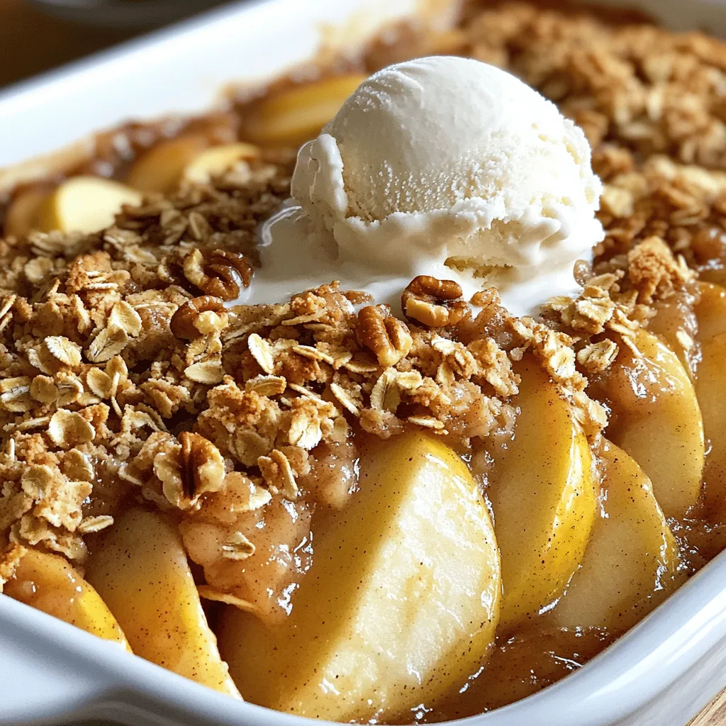 - 4 large apples (preferably Granny Smith or Honeycrisp), peeled, cored, and sliced - 1 teaspoon fresh lemon juice - 1 cup rolled oats - 1/2 cup all-purpose flour - 1/2 cup packed light brown sugar - 1/2 teaspoon ground cinnamon - 1/4 teaspoon ground nutmeg - 1/4 teaspoon kosher salt - 1/2 cup unsalted butter, melted - 1/4 cup chopped walnuts or pecans (optional for added crunch) - Vanilla ice cream or whipped cream for serving (optional) Choose fresh apples for the best taste. Granny Smith apples add a nice tartness, while Honeycrisp offers sweetness. Peel, core, and slice them evenly to ensure they cook at the same rate. Adding lemon juice helps prevent browning and adds a zesty kick. When measuring flour, spoon it into the cup and level it off. This gives you the right amount for the recipe. For the topping, make sure your butter is melted but not too hot. This helps mix the dry ingredients better. If you want a crunchy topping, don’t skip the nuts. They add great flavor and texture. If you don’t have Granny Smith apples, you can use any tart apple. Fuji or Braeburn work well too. For a gluten-free version, swap the all-purpose flour with a gluten-free blend. You can also replace the butter with coconut oil for a dairy-free option. If you want a sweeter taste, use brown sugar instead of white sugar. If you have no nuts, feel free to leave them out or use seeds instead. Start by preheating your oven to 350°F (175°C). This is key for even baking. A hot oven helps the apples cook well and the topping crisp up nicely. Next, take your four large apples. Peel, core, and slice them thin. I recommend using Granny Smith or Honeycrisp apples. They add a nice tart flavor. Place the apple slices in a large bowl. Drizzle one teaspoon of fresh lemon juice over them. Toss gently to coat all the slices. This keeps them from browning and adds a zesty taste. In a separate bowl, combine the dry ingredients. Mix one cup of rolled oats, half a cup of all-purpose flour, and half a cup of packed light brown sugar. Add half a teaspoon of ground cinnamon, a quarter teaspoon of ground nutmeg, and a quarter teaspoon of kosher salt. Stir until everything is well mixed. This will be your tasty topping. Now, melt half a cup of unsalted butter. Pour the melted butter over the dry mix. Stir with a fork until it looks crumbly. If you like nuts, fold in a quarter cup of chopped walnuts or pecans now. This adds a nice crunch. Spread the apple slices evenly in a greased 9x13 inch baking dish. Sprinkle the oat topping over the apples. Make sure to cover all the apple slices. This ensures no gaps. Now, place the baking dish in the oven. Bake for 30 to 35 minutes. Look for the apples to get tender and the topping to turn golden brown. You’ll know it’s ready when you smell that sweet aroma wafting through your kitchen! Once it's done, take it out and let it cool for a few minutes before serving. This rest time helps the flavors come together. Enjoy with a scoop of vanilla ice cream or a dollop of whipped cream if you like! To get the best texture, choose the right apples. I like Granny Smith or Honeycrisp. They hold their shape well and bring a nice tart flavor. Peel, core, and slice them thin. This helps them cook evenly. Mix the apples with lemon juice. It keeps them fresh and adds a zing. When making the topping, combine oats, flour, and sugar well. Drizzling melted butter helps create a crumbly texture. If you want more crunch, add chopped walnuts or pecans. To boost flavors, don't skip the spices. Ground cinnamon and nutmeg add warmth and depth. You can even add a pinch of ginger for a kick. If you like sweetness, adjust the brown sugar to taste. You can also mix in some vanilla extract for extra aroma. If you use tart apples, a bit more sugar can help balance the flavor. Experiment with your favorite nuts or seeds for a twist! Serve your apple crisp warm for the best experience. A scoop of vanilla ice cream adds a lovely cold contrast. Whipped cream is another great option. You can also top it with caramel sauce for extra sweetness. If you want a fun twist, serve it in individual dishes. It looks nice and is easy to share. Enjoy this dessert with family and friends for a cozy treat! {{image_4}} If you want to make a nut-free apple crisp, simply leave out the chopped walnuts or pecans. The recipe will still taste great without them. You can add extra oats or some seeds, like pumpkin or sunflower seeds, for a bit of crunch. These seeds give a nice texture and keep it nut-free while still being delicious. Using tart apples can make your apple crisp even better. Granny Smith apples are my top choice. They add a nice tang that balances the sweetness. You can also try other tart apples, like Jonagold or Braeburn. Mixing a few types of apples can bring different flavors to the dish. This mix can make each bite unique and tasty. Adding seasonal fruits can take your apple crisp to a new level. In fall, try adding cranberries for a bright flavor. In summer, you can mix in berries like raspberries or blueberries. These fruits add a fresh twist and extra color. Just make sure to adjust the sugar a bit if you add tart fruits, so the crisp remains sweet and balanced. To keep your apple crisp fresh, let it cool fully. Once cooled, cover the dish tightly with plastic wrap or aluminum foil. You can also transfer it to an airtight container. Store it in the fridge for up to three days. This way, the apples stay tasty, and the topping won’t get too soft. When you want to enjoy your apple crisp again, preheat your oven to 350°F (175°C). Place the apple crisp in an oven-safe dish. Cover it with foil to keep it from browning too much. Heat for about 15-20 minutes. If you want a crispier topping, remove the foil for the last 5 minutes. You can also reheat individual servings in the microwave for about 30-45 seconds. If you want to save some for later, freezing is a great option. After cooling, wrap the apple crisp tightly in p