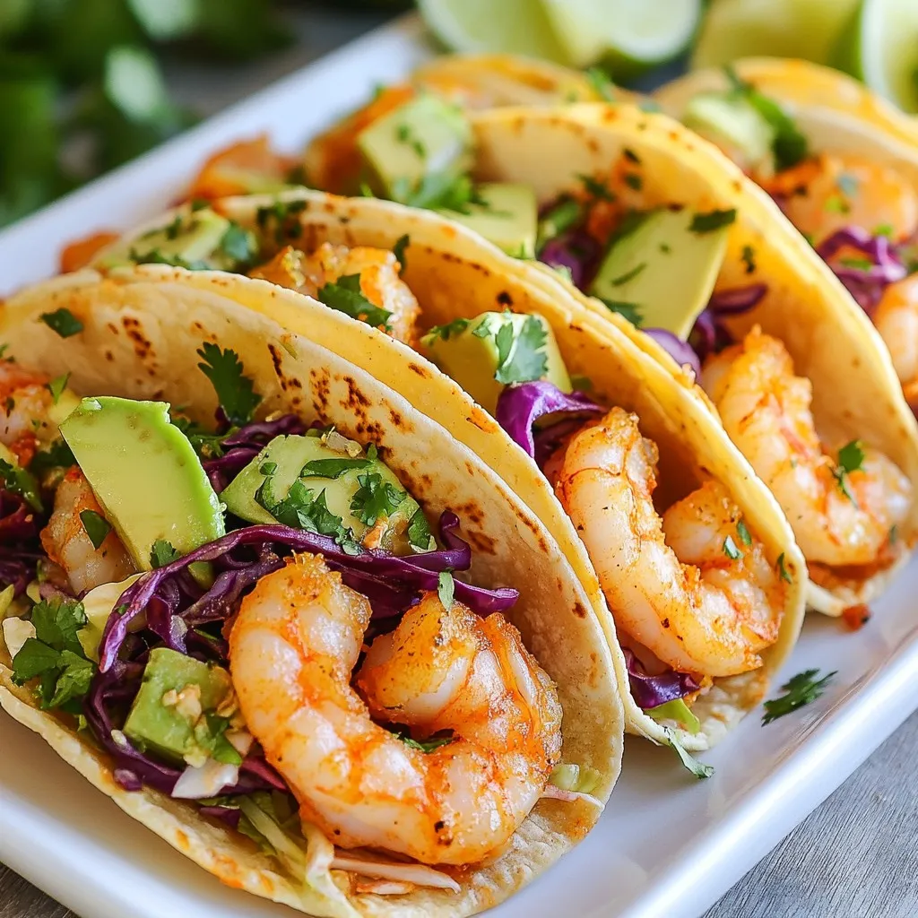 Delicious shrimp tacos with a zesty kick, topped with fresh ingredients.
