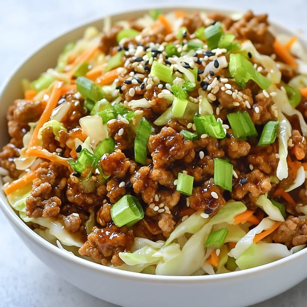 - 1 pound ground turkey (or chicken) - 1 tablespoon sesame oil - 4 cups coleslaw mix - 2 cloves garlic, minced - 1 tablespoon fresh ginger, peeled and minced - 3 green onions, finely sliced - 1/4 cup low-sodium soy sauce - 1 tablespoon rice vinegar - Optional: Sriracha or chili sauce for an extra kick In this dish, the ground turkey or chicken serves as a great protein base. The sesame oil adds a unique nutty flavor and helps cook the meat. The coleslaw mix is your colorful veggie blend, bringing crunch and freshness. For aromatics, garlic and ginger add depth to the dish. Green onions sprinkle on top for color and a mild onion taste. To bring it all together, low-sodium soy sauce and rice vinegar provide a perfect balance of salty and tangy. If you like heat, a bit of sriracha or chili sauce will take it to the next level. Everything combines to create a warm, hearty meal. You can customize with your favorite sauces or toppings. Enjoy making this easy weeknight meal! {{ingredient_image_2}} To start, heat 1 tablespoon of sesame oil in a large skillet or wok. Set the heat to medium-high. Wait until the oil shimmers, which means it's ready. Next, add 1 pound of ground turkey or chicken to the skillet. Use a spatula to break it into smaller pieces. Cook for about 5 to 7 minutes. The meat should turn brown and lose its pink color. Season it lightly with salt and pepper. Now it’s time to add some flavor! Stir in 2 cloves of minced garlic and 1 tablespoon of minced fresh ginger. Cook for 1 to 2 minutes. You’ll notice the lovely aroma filling your kitchen. Then, toss in 4 cups of coleslaw mix. This is where the crunch comes in. Stir well to combine it with the meat and spices. Cook for about 3 to 4 minutes. You want the cabbage to be tender but still crisp. Pour in 1/4 cup of low-sodium soy sauce and 1 tablespoon of rice vinegar. Toss everything to coat it evenly. Let it cook for another 2 to 3 minutes. This allows the flavors to blend nicely. Once done, take the skillet off the heat. Fold in 3 finely sliced green onions, saving some for garnish. Before serving, taste the dish. If you like heat, add some sriracha or chili sauce. Now, scoop the mixture into bowls. Garnish each bowl with sesame seeds and the reserved green onions. Enjoy your colorful and tasty meal! To get the best flavor, start by browning the meat well. This step adds depth. Use medium-high heat and break the turkey into small bits. Cook it until it turns golden brown and loses its pink color. This usually takes 5 to 7 minutes. For the cabbage, you want a bit of crunch. Cook the coleslaw mix just enough so it softens slightly. This should take about 3 to 4 minutes. It is key to stir often. This helps the flavors blend and keeps the cabbage from getting too soft. Pair this dish with a side of steamed rice or quinoa. These grains soak up the yummy sauce. You can also add a simple salad for freshness. For serving, choose colorful bowls. A bright bowl makes the dish pop. Try adding shredded carrots or sliced cucumbers on top. This adds color and texture, and it looks great on the table. If you love heat, add some sriracha or chili sauce. Start with a teaspoon and taste as you go. You can always add more if needed. To balance the spice, consider a little honey or sugar. This can cut the heat and add a nice touch. Pair it with soy sauce or rice vinegar to ensure the flavors mix well. Pro Tips Use Fresh Ingredients: Fresh garlic and ginger will elevate the flavor of your dish. Avoid using pre-minced versions for the best taste. Customize Your Veggies: Feel free to add other vegetables like bell peppers, snap peas, or mushrooms for additional flavor and texture. Adjust the Heat: If you prefer a milder dish, start with a small amount of sriracha and add more gradually to suit your taste. Perfect Your Presentation: Serve in colorful bowls and consider adding fresh herbs or lime wedges for a vibrant touch. {{image_4}} You can easily make this dish vegetarian. Start by substituting ground turkey with tofu. Use firm tofu for the best texture. Simply press and crumble it before cooking. This will absorb all the great flavors. To add more depth, include mushrooms. They bring a rich, umami taste. You can also mix in more veggies like bell peppers, zucchini, or snap peas. This adds color and crunch to your bowl. If you follow a keto diet, you can still enjoy this dish. Swap the coleslaw mix for low-carb veggies. Options include shredded broccoli stems or spiralized zucchini. Both reduce carbs without losing flavor. Adjust the sauces, too. Look for no-sugar soy sauce or coconut aminos. These keep the taste bold while fitting your diet. Explore different flavor profiles by changing the sauces. Try hoisin or teriyaki sauce for a sweet twist. You can also add peanut sauce for a nutty flavor. Consider adding nuts for crunch and protein. Chopped peanuts or cashews work well. If you want more protein, include shrimp or diced chicken. This keeps the meal exciting and satisfying. To store Egg Roll in a Bowl, let it cool first. Place it in an airtight container. This keeps the flavors fresh and prevents moisture loss. It is best to eat it within 3 to 4 days. The dish holds well, but the cabbage may lose some crunch over time. When reheating, use a skillet over medium heat. This method warms the dish evenly and keeps it from getting soggy. Stir gently to keep all the ingredients intact. If you want to freeze it, portion it out first. Store it in freezer-safe containers. It can last up to 3 months in the freezer. Just remember to thaw it overnight in the fridge before reheating. Egg Roll in a Bowl lasts about 3 to 4 days in the fridge. To keep it fresh, store it in an airtight container. This helps prevent moisture loss and keeps flavors intact. If you notice any off smells or changes in texture, it is best to discard it. Yes, you can make Egg Roll in a Bowl ahead of time. This dish is great for meal prep! Cook it fully and let it cool. Then, portion i