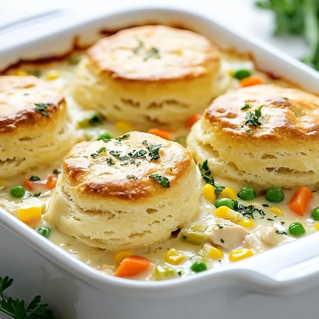 A hearty and comforting chicken pot pie casserole filled with tender chicken and vegetables, topped with flaky biscuits.