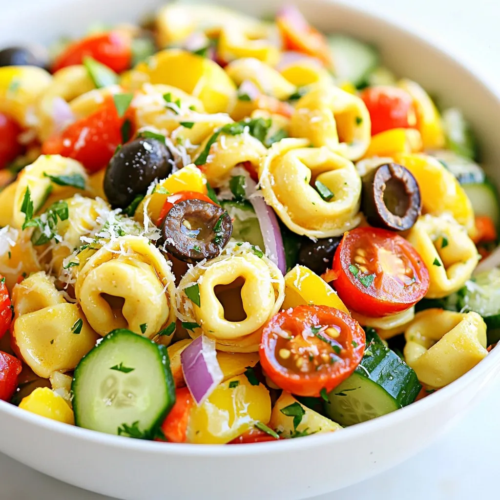 A refreshing and colorful pasta salad featuring cheese tortellini and a variety of fresh vegetables, dressed in Italian dressing.