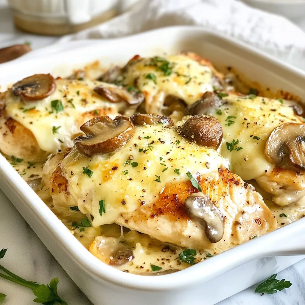 A creamy and flavorful chicken casserole with garlic, mushrooms, and cheese, perfect for a keto diet.