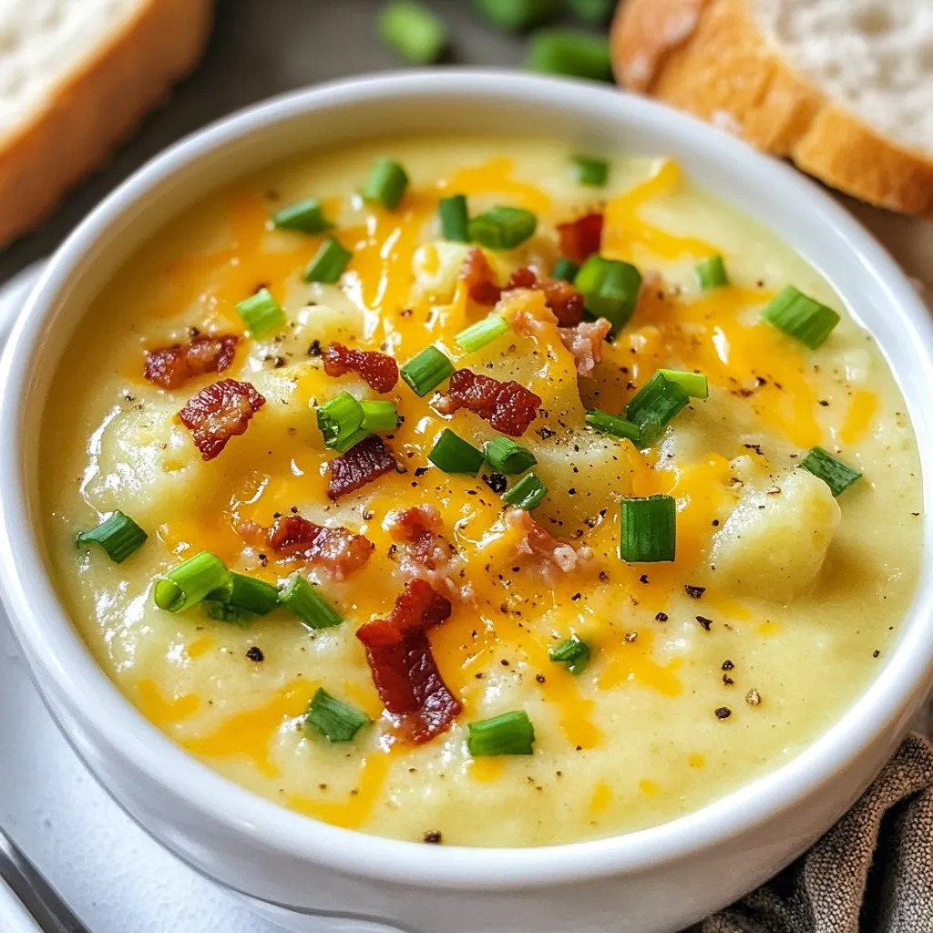 To make a tasty loaded baked potato soup, you need a few key ingredients: - 4 large russet potatoes, peeled and diced into bite-sized pieces - 1 medium onion, finely chopped - 3 cloves garlic, minced - 4 cups vegetable broth - 1 cup heavy cream - 1 cup shredded sharp cheddar cheese (plus more for garnishing) - 1/2 cup sour cream - 4 slices turkey bacon, cooked until crispy and crumbled - 1 teaspoon dried thyme - 1 teaspoon smoked paprika - Salt and black pepper to taste - Chopped green onions for garnish These ingredients give the soup its creamy texture and rich flavor. The potatoes serve as the base, while the cheese and cream add depth. The spices bring warmth, and bacon adds a delightful crunch. You can easily swap some ingredients to fit your needs: - Potatoes: Use Yukon Gold or red potatoes for a different flavor. - Vegetable broth: Chicken broth works well if you prefer a non-vegetarian option. - Heavy cream: Substitute with half-and-half or coconut milk for a lighter version. - Cheddar cheese: Try Monterey Jack or Gouda for a unique taste. - Sour cream: Greek yogurt can work well as a healthy alternative. - Turkey bacon: You can use regular bacon or omit it for a vegetarian version. These swaps can change the taste and texture, so feel free to experiment! To make this soup, you will need a few key tools: - Large pot for cooking - Knife and cutting board for chopping - Immersion blender or regular blender for pureeing - Measuring cups and spoons for accuracy - Ladle for serving Having these tools ready will make your cooking process smooth and fun! {{ingredient_image_2}} Start by heating a drizzle of olive oil in a large pot over medium heat. Add one finely chopped onion. Sauté the onion for about five minutes. You want it to be soft and translucent. Next, stir in three minced garlic cloves. Cook for one more minute. You’ll smell the garlic soon! Be careful not to let it burn. Now it’s time for the potatoes. Take four large russet potatoes and peel them. Dice them into bite-sized pieces. Add these potatoes to the pot with the onion and garlic. Pour in four cups of vegetable broth. Bring this mixture to a boil. Then, reduce the heat to low and cover the pot. Let it simmer for 15 to 20 minutes. The potatoes should be fork-tender when done. Once the potatoes are cooked, grab an immersion blender. Carefully blend the soup until it’s smooth and creamy. If you like some chunks, blend just half of it. You can also use a regular blender in batches if you prefer. After blending, return the soup to the pot. Stir in one cup of heavy cream, one cup of shredded sharp cheddar cheese, and half a cup of sour cream. Add one teaspoon of dried thyme and one teaspoon of smoked paprika. Season with salt and black pepper to taste. Cook this over low heat. Stir often until the cheese melts and the soup warms through. Taste it and adjust the seasoning if needed. If you want a thinner soup, add more vegetable broth or water until it’s just right. To get the right texture, blend the soup well. Use an immersion blender for a creamy finish. If you like chunks, blend half the soup. This mix gives you both smooth and hearty bites. Cook the potatoes until they are fork-tender. This step helps them break down easily in the soup. If the soup is too thick, add more broth or water to thin it out. To boost flavor, add fresh herbs like chives or parsley. You can also sprinkle in some garlic powder for extra taste. Watch out for salt; taste as you go. Too much salt can ruin the dish. Another mistake is overcooking the garlic. It can turn bitter quickly, so add it after the onion is soft. Lastly, make sure to use sharp cheddar cheese. It adds a punch of flavor that mild cheese can't match. For serving, ladle the soup into bowls and top with crumbled turkey bacon. Add extra shredded cheese and chopped green onions for color. Pair it with crusty bread for a full meal. If you want a fun twist, serve it in bread bowls. This gives a rustic feel and adds more flavor. Enjoy your warm, hearty soup with friends or family for a cozy night. Pro Tips Use Yukon Gold Potatoes: For a creamier texture and naturally buttery flavor, consider using Yukon Gold potatoes instead of russets. Cheese Variations: Experiment with different types of cheese like Gruyère or fontina for a unique twist on flavor! Add Veggies: Incorporate additional vegetables like carrots or celery for extra nutrition and depth of flavor. Make it Vegan: Substitute heavy cream with coconut milk and use vegan cheese for a delicious plant-based version. {{image_4}} You can make loaded baked potato soup healthier without losing flavor. Here are some swaps: - Use low-fat milk or almond milk instead of heavy cream. - Replace sour cream with Greek yogurt. It adds creaminess and protein. - Try using turkey bacon or omit it for a vegetarian option. - Add more veggies like spinach or broccoli for extra nutrients. These changes keep the soup tasty while making it lighter. Want to boost the flavor of your loaded baked potato soup? Here are some great ideas: - Add fresh herbs like chives or parsley for a fresh taste. - Enjoy a sprinkle of nutritional yeast for a cheesy flavor without dairy. - Mix in some sautéed mushrooms or bell peppers for depth. - Top with jalapeños if you like a spicy kick. These add-ins can enhance the soup and add new layers of flavor. You can change up your loaded baked potato soup for different seasons. Here are some fun ideas: - In fall, add pumpkin puree for a warm, autumn twist. - For winter, try adding roasted garlic for a cozy flavor. - In spring, mix in fresh peas and mint for a bright taste. - In summer, use fresh corn for sweetness and crunch. These seasonal variations keep your soup exciting and fresh all year round. To store loaded baked potato soup, let it cool first. Pour the soup into an airtight container. Make sure to leave some space at the top. This allows for expansion when freezing. You can keep it in the fridge for up to th