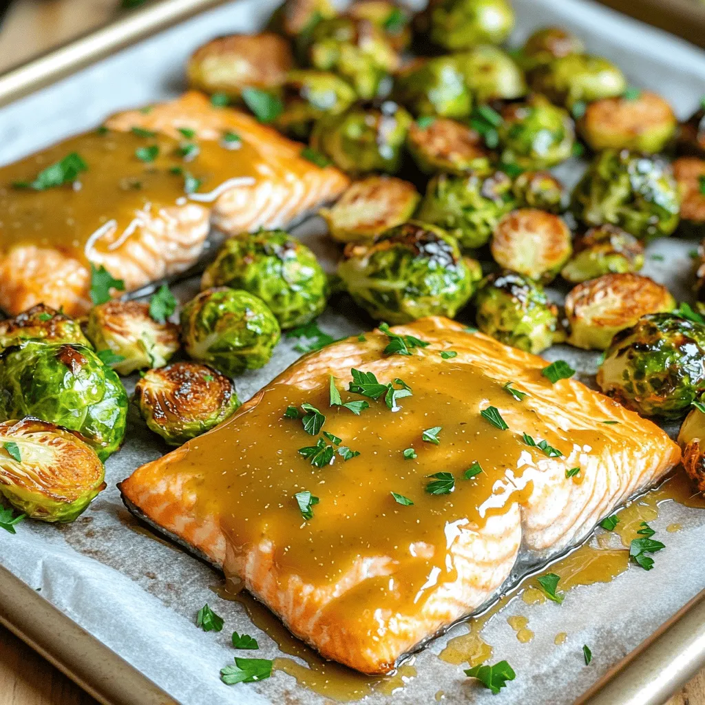 For caramelized Brussels sprouts, start with fresh and firm sprouts. Trim and halve them. Spread them out on the baking sheet to avoid steaming. Drizzle half of the maple Dijon sauce over them and toss well. The sauce helps them brown nicely. Roast alongside the salmon for 15-20 minutes. Look for a golden color and tender texture. If you like a bit of crunch, broil them for the last few minutes. This adds a delightful taste.