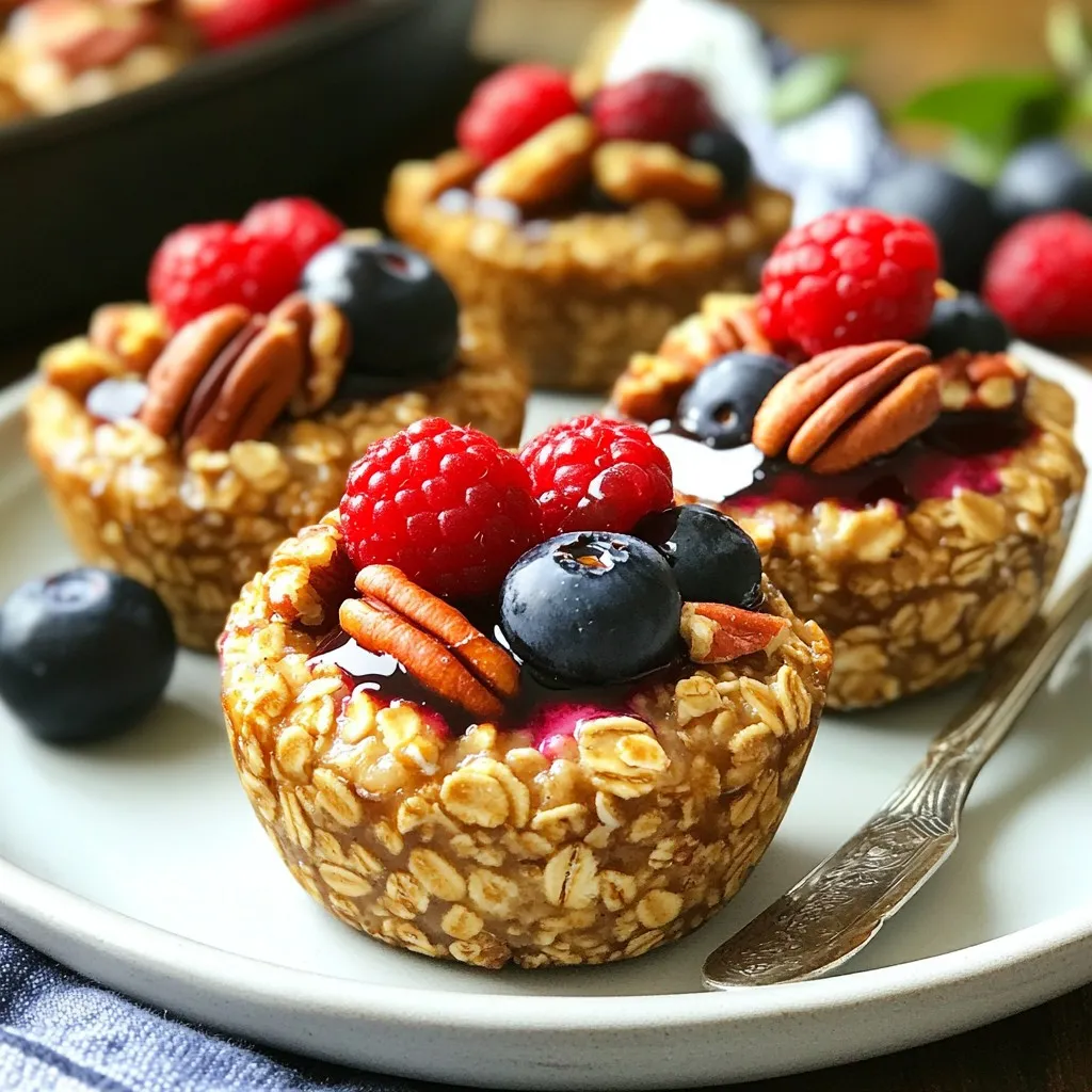 The main ingredients create a tasty and healthy base for the oatmeal cups. Rolled oats give a hearty texture. Chopped pecans add a nice crunch and nutty flavor. Maple syrup brings sweetness, making them delightful. Almond milk keeps the recipe creamy and dairy-free. The ripe banana adds moisture and natural sweetness. Vanilla extract and ground cinnamon enhance the flavors. Baking powder helps the cups rise, while salt balances the taste.