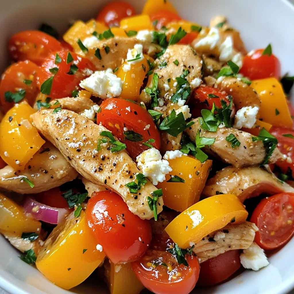 In this dish, I use boneless, skinless chicken breasts. They cook fast and stay juicy. I slice them into thin strips for even cooking. Fresh vegetables create a burst of flavor. I love using red and yellow bell peppers. They add sweetness and color. Cherry tomatoes give a juicy pop. Red onion adds a nice sharp bite.
