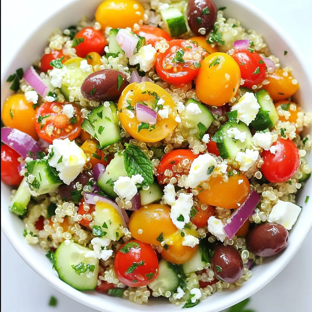 To make this tasty Mediterranean quinoa salad, you will need: - 1 cup quinoa, thoroughly rinsed - 2 cups vegetable broth or water - 1 cup cherry tomatoes, halved - 1 cucumber, diced into bite-sized pieces - 1/2 red onion, finely chopped - 1/2 cup Kalamata olives, pitted and halved - 1/2 cup crumbled feta cheese - 1/4 cup fresh parsley, chopped - 1/4 cup fresh mint, chopped - 3 tablespoons extra virgin olive oil - 2 tablespoons fresh lemon juice - 1 teaspoon dried oregano - Salt and freshly ground black pepper to taste You can swap some ingredients if needed: - Quinoa: You can use farro or couscous for a different texture. - Feta Cheese: Try goat cheese or a vegan cheese for a dairy-free option. - Kalamata Olives: Black olives or green olives also work well. - Fresh Herbs: Use basil or dill if parsley and mint aren’t available. This salad is not only tasty but also healthy. Here’s what you get per serving (based on 4 servings): - Calories: About 250 - Protein: 8g - Carbohydrates: 30g - Fiber: 5g - Fat: 12g This dish gives you good energy, fiber, and healthy fats. Enjoy the freshness and flavor while knowing you're eating well! {{ingredient_image_2}} To cook quinoa, start with 1 cup of rinsed quinoa. Rinsing removes the bitter coating. In a medium saucepan, add 2 cups of vegetable broth or water. Bring it to a boil over medium-high heat. Once boiling, add the quinoa. Reduce the heat to low and cover it with a lid. Let it simmer for about 15 minutes. You want all the liquid absorbed. After that, take it off the heat and let it rest for 5 minutes. This helps the quinoa finish cooking. Fluff the quinoa gently with a fork. Set it aside to cool completely. In a large mixing bowl, combine the cooled quinoa with the following ingredients: - 1 cup cherry tomatoes, halved - 1 cucumber, diced into bite-sized pieces - 1/2 red onion, finely chopped - 1/2 cup Kalamata olives, pitted and halved - 1/2 cup crumbled feta cheese - 1/4 cup fresh parsley, chopped - 1/4 cup fresh mint, chopped Gently fold the ingredients together. Make sure everything is evenly mixed. You want all those bright colors and fresh flavors to blend. For the dressing, take a small bowl. Whisk together these ingredients: - 3 tablespoons extra virgin olive oil - 2 tablespoons fresh lemon juice - 1 teaspoon dried oregano - Salt and freshly ground black pepper to taste This dressing adds a zesty kick. Drizzle it over the quinoa salad mixture. Use a spatula to toss the salad gently. Ensure all ingredients are well-coated with the dressing. Taste the salad. If needed, add more salt and pepper. Allow it to sit at room temperature for about 15 minutes. This resting time helps the flavors meld beautifully. To fluff quinoa, follow these simple steps. First, rinse the quinoa well. This removes the bitter coating. After cooking, let it sit covered for five minutes. This step helps the quinoa absorb steam. Then, use a fork to gently stir the grains. This separates them and makes them light and fluffy. You can serve this salad in many ways. Try placing it in a glass bowl or on a large platter. Add some extra herbs on top for color. A sprinkle of feta cheese adds a nice touch. This salad pairs well with grilled meats or fish. You can also serve it as a light lunch. To boost the flavors, use fresh herbs like parsley and mint. Their brightness lifts the dish. A splash of lemon juice adds zest. You can also add more spices like cumin or paprika. For a spicy kick, consider red pepper flakes. Always taste and adjust the seasoning. This ensures the dish meets your flavor preference. Pro Tips Choose the Right Quinoa: For a nuttier flavor and better texture, opt for tri-color quinoa. It adds visual appeal and a delightful crunch. Chill Before Serving: Allow the salad to chill in the refrigerator for at least 30 minutes before serving. This enhances the flavor and makes it more refreshing. Customize Your Veggies: Feel free to add or substitute other vegetables like bell peppers or radishes for extra color and crunch. Use Fresh Herbs: Always use fresh herbs instead of dried for a more vibrant flavor. Fresh parsley and mint make a significant difference in taste. {{image_4}} To make a vegan version, leave out the feta cheese. Replace it with avocado or a vegan cheese. You can add more beans too. Chickpeas work great for added protein. This keeps the salad hearty and filling. You can also mix in some sunflower seeds for crunch. Toss in a handful of arugula for a peppery bite. If you want extra protein, add grilled chicken. Use about one cup of sliced chicken breast. Season the chicken with lemon juice, salt, and pepper before grilling. Slice it thin and layer it over the salad. This adds a nice depth of flavor and makes it a full meal. You can also marinate the chicken in olive oil and herbs for extra taste. Feel free to get creative with your veggies! Add bell peppers, zucchini, or even artichoke hearts. Try roasting the vegetables for added flavor. You can also use frozen peas or corn for a sweet pop. Just make sure to chop them into similar sizes for even mixing. This variation keeps the salad fresh and colorful. After enjoying your Mediterranean quinoa salad, store leftovers in an airtight container. This helps keep the salad fresh. Place it in the fridge. It will stay good for about 3 to 5 days. When you’re ready to eat, check for any signs of spoilage before serving. You can freeze quinoa salad, but it may change texture. To freeze, place it in a freezer-safe container. Be sure to leave some space at the top for expansion. It can last up to 3 months in the freezer. When ready to eat, thaw in the fridge overnight before serving. To reheat, gently warm the salad in a pan over low heat. Stir often to avoid burning. You can also use the microwave. Heat in short bursts at medium power. Avoid overheating, as it can make the salad mushy. For best results, serve at room temperature. Yes, you can make this salad ahead of time. It tastes even better after t