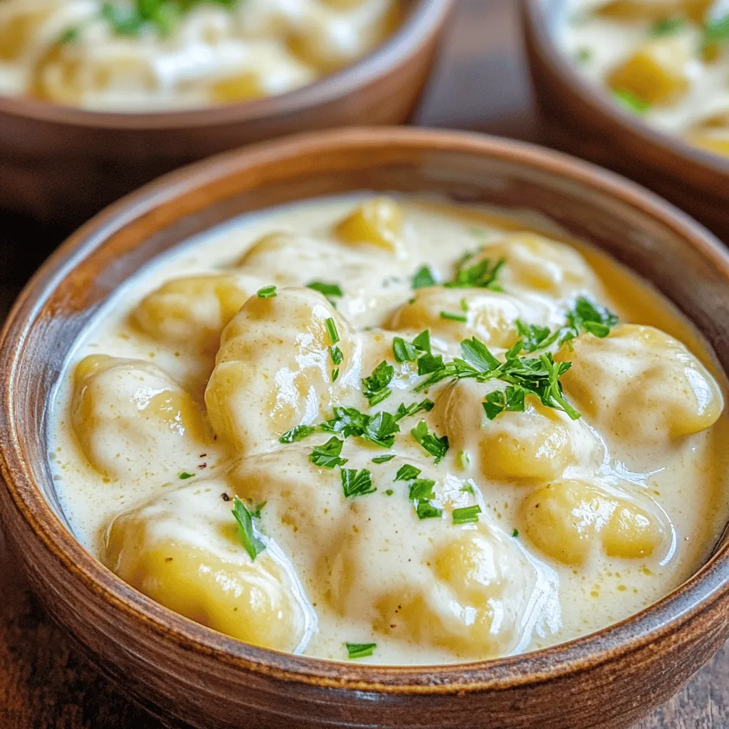 To make Minute Creamy Garlic Gnocchi, gather these items: - 1 pound potato gnocchi - 2 tablespoons unsalted butter - 4 cloves garlic, minced - 1 cup heavy cream - 1 cup grated Parmesan cheese - 1 teaspoon Italian seasoning - Salt and freshly cracked black pepper to taste - Fresh parsley, chopped (for garnish) You can swap some ingredients if needed. Here are a few ideas: - Use olive oil instead of unsalted butter for a lighter option. - Replace heavy cream with half-and-half for a lower fat version. - If you don't have Parmesan, try Pecorino Romano or nutritional yeast for a vegan touch. - Use dried herbs if you lack fresh ones; just adjust the amount since dried herbs are stronger. For the best results, consider these brands: - Gnocchi: Look for De Cecco or Rana for quality potato gnocchi. - Butter: Kerrygold provides rich and creamy unsalted butter. - Parmesan Cheese: Grana Padano or BelGioioso offer great flavors. - Heavy Cream: Organic Valley is a reliable choice for fresh cream. Start by filling a large pot with water. Add salt to it. Bring the water to a rolling boil. Carefully add 1 pound of potato gnocchi. Cook them until they float, about 2-3 minutes. Once they float, they are done. Drain them in a colander and set aside. In a large skillet, melt 2 tablespoons of unsalted butter over medium heat. Wait until the butter is bubbly. Add 4 cloves of minced garlic to the skillet. Sauté the garlic for 1-2 minutes. Stir it often until it is fragrant and golden. Be careful not to burn the garlic. Gradually pour in 1 cup of heavy cream while whisking. This helps mix the cream with the garlic and butter. Raise the heat a bit to bring the sauce to a gentle simmer. Let it simmer for 3-4 minutes. Stir it occasionally until the sauce thickens slightly. Now, reduce the heat to low. Stir in 1 cup of grated Parmesan cheese and 1 teaspoon of Italian seasoning. Mix until the cheese melts, and the sauce is creamy. Taste the sauce. Add salt and freshly cracked black pepper to your liking. Gently fold the cooked gnocchi into the creamy sauce. Make sure each piece is coated well. Heat everything for an extra minute. This helps the flavors blend. Remove the skillet from heat. Transfer the creamy gnocchi to serving bowls. For a nice touch, sprinkle chopped fresh parsley on top. Enjoy your meal! To make the sauce just right, use heavy cream. This gives your sauce a rich, smooth feel. Whisk it in slowly to blend with the garlic and butter. Keep stirring as it heats. You want a gentle simmer, not a hard boil. This helps the sauce thicken nicely. If you want a thicker sauce, let it simmer longer. Just remember to stir often to avoid burning. Gnocchi cooks fast! Boil them in salted water until they float. This usually takes about 2-3 minutes. Be careful not to overcook them. If they sit too long, they can get mushy. Drain them quickly and set aside. Use a wide pot to give them space to move. This helps them cook evenly and prevents sticking. To boost the flavor, add Italian seasoning to the sauce. Just a teaspoon is enough to make a difference. You can also try fresh herbs like basil or thyme. They add bright notes to the dish. A pinch of red pepper flakes can add some heat. For more depth, use freshly cracked black pepper and salt to taste. These simple tweaks can turn a good dish into a great one. {{image_4}} You can boost the nutrition and flavor by adding vegetables. Try spinach, peas, or broccoli. Simply sauté them in the skillet with the garlic. This adds color and a fresh taste to your dish. You can also use roasted bell peppers or zucchini for a twist. Just chop them small so they mix well with the gnocchi. Adding protein makes this meal heartier. Cooked chicken, shrimp, or sausage mix well with the creamy sauce. You can add them right after the garlic is sautéed. If you want a meat-free option, try chickpeas or white beans. They add great texture and protein without meat. Feel free to play with the sauce! For a lighter option, use half and half instead of heavy cream. You can also add a splash of lemon juice for a zesty kick. For a twist, try using pesto or a tomato sauce. Just mix it with the garlic and butter before adding the gnocchi. Each option gives a new flavor to explore! To store leftovers, let the gnocchi cool down first. Place any extra in an airtight container. This helps keep the creamy sauce fresh. You can keep it in the fridge for up to three days. If you want to enjoy it later, make sure you don’t let it sit out for too long. When you want to reheat the gnocchi, use a skillet on low heat. Add a splash of cream or water to help loosen the sauce. Stir gently until everything is warm. This method keeps the gnocchi soft and creamy. You can also use the microwave. Heat in short bursts, stirring often. This helps prevent hot and cold spots. To freeze, first cool the gnocchi completely. Transfer it to a freezer-safe bag or container. It's best to use it within two months for the best taste. When you’re ready to eat, thaw it overnight in the fridge. Reheat as mentioned before. Keep in mind, the texture may change a bit after freezing. It takes about 15 minutes to make Minute Creamy Garlic Gnocchi. The prep time is just 5 minutes. Cooking the gnocchi and making the sauce takes the remaining 10 minutes. You can have a tasty meal ready in no time. Yes, you can use different cheeses in this recipe. Some great options are mozzarella, feta, or even ricotta. Each cheese adds a unique flavor and texture. Just remember, the creaminess may change slightly. Most potato gnocchi is not gluten-free. It often contains wheat flour. However, you can find gluten-free gnocchi made from corn or rice flour. Check labels to find the best option for your needs. You can serve creamy garlic gnocchi with many sides. A fresh green salad pairs nicely. Garlic bread or roasted vegetables also work well. For protein, grilled chicken or shrimp can make a complete meal. To make this dish vegetarian, simply ensure all 