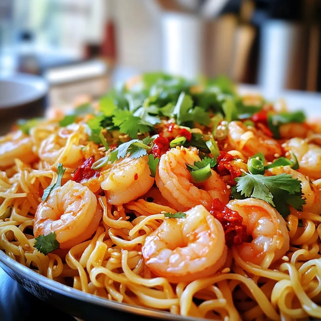 Serve and Garnish: Transfer the delightful spicy shrimp noodles onto a serving platter or individual bowls. Finish by garnishing with fresh cilantro leaves for a pop of color and flavor.