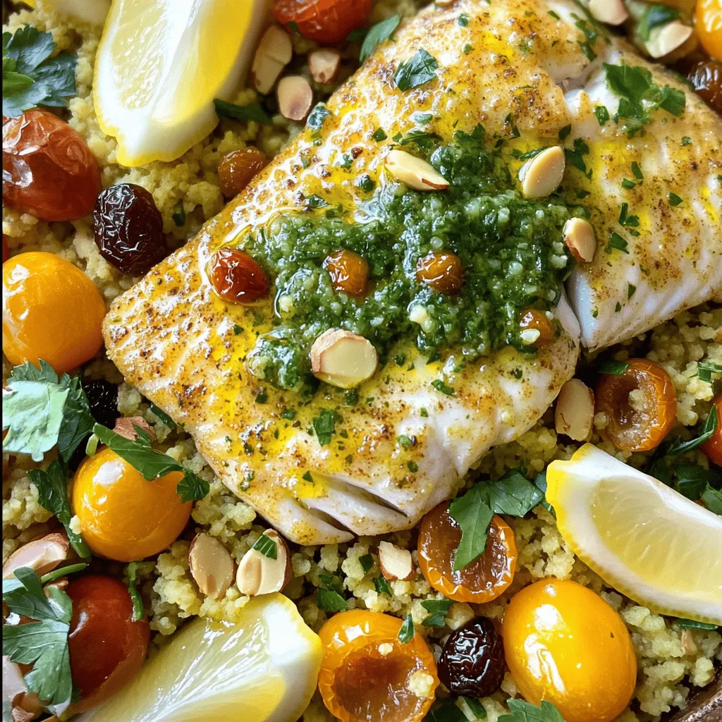 To serve, spoon a generous portion of the herb couscous onto each plate. Place a baked fish fillet on top of each serving. Drizzle the remaining chermoula marinade over the fish to boost the flavor. For a fresh touch, add extra sprigs of fresh herbs or lemon wedges on the side. This adds color and a burst of flavor.