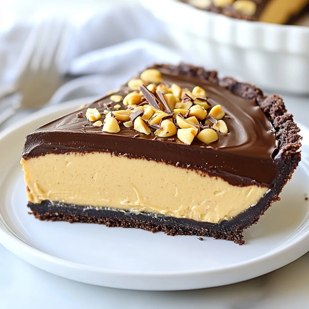 Here’s what you need for the No-Bake Chocolate Peanut Butter Pie. Each ingredient plays a key role in creating that perfect balance of flavor and texture. - 1 ½ cups chocolate cookie crumbs (such as crushed Oreos) - ½ cup unsalted butter, melted - 1 cup creamy peanut butter - 1 cup powdered sugar - 8 oz cream cheese, softened to room temperature - 1 cup whipped topping (store-bought or homemade) - 1 cup semi-sweet chocolate chips - ½ cup heavy cream - Chopped peanuts and chocolate shavings for garnish These ingredients come together to create a delightful treat. The chocolate cookie crumbs form the crust, giving a rich base. The creamy peanut butter and cream cheese mix create a smooth filling. Topping it all off, the chocolate ganache adds a shiny finish. Don't forget the garnishes! Chopped peanuts and chocolate shavings make the pie look inviting. Each bite is a mix of flavors that everyone will love. {{ingredient_image_2}} In a medium bowl, combine 1 ½ cups of chocolate cookie crumbs with ½ cup of melted unsalted butter. Mix until every crumb is coated. Press this mixture firmly into a 9-inch pie pan. Make sure the crust is even on the bottom and sides. Refrigerate for about 15 minutes. This helps the crust firm up. Take a large bowl and add 8 ounces of softened cream cheese and 1 cup of creamy peanut butter. Use an electric mixer to beat them together until smooth. Gradually add 1 cup of powdered sugar. Mix well until fully combined. The filling should be light and fluffy. Now, take 1 cup of whipped topping. Carefully fold it into the peanut butter mixture with a rubber spatula. This step is key. You want to keep the airiness to make the filling light and creamy. Pour the peanut butter filling into the chilled crust. Use a spatula to spread it evenly. Smooth the top to make it nice and flat. Put the pie back in the fridge while you make the ganache. In a small saucepan, combine ½ cup of heavy cream and 1 cup of semi-sweet chocolate chips. Place it over low heat. Stir continuously until the chips melt and the ganache is smooth. Remove it from the heat and let it cool slightly. This allows it to thicken without hardening. Carefully pour the warm ganache over the peanut butter filling. Use a spatula to spread it into an even layer. Return the pie to the refrigerator. Chill for at least 4 hours. This helps the ganache set and become firm. To make a great crust, use chocolate cookie crumbs. I love crushed Oreos for their flavor. Mix the crumbs with melted butter until it looks like wet sand. When you press the crumbs, use a flat bottom of a cup for even pressure. Make sure to press the mix into the bottom and up the sides of the pie pan. Refrigerate the crust for 15 minutes to help it set. If you want a change, try graham crackers or vanilla wafers instead. For the filling, start with room temperature cream cheese. This helps it mix smooth with the peanut butter. Use an electric mixer on medium speed to blend. Add the powdered sugar slowly, mixing after each addition. This keeps the filling fluffy and light. When you fold in the whipped topping, be gentle. A rubber spatula works best here. This keeps air in the mix and makes it creamy. When making the ganache, melt the chocolate chips with the heavy cream over low heat. Stir continuously to prevent burning. Once melted, remove it from heat but let it cool slightly. This cooling helps it thicken without hardening. To check the thickness, dip a spoon in. If it coats the back, you’re ready to pour. For a smooth finish, pour slowly over the filling. Use a spatula to spread it evenly. Pro Tips Chill Your Ingredients: Ensure that the cream cheese and whipped topping are at room temperature before mixing to achieve a smooth and creamy filling. Use Quality Chocolate: Opt for high-quality semi-sweet chocolate chips for the ganache to enhance the overall flavor of the pie. Let It Set: For the best texture, allow the pie to chill for a full 4 hours or overnight. This will ensure that the ganache is perfectly set and the layers meld beautifully. Garnish Generously: Don't skimp on the chopped peanuts and chocolate shavings! They add a delightful crunch and visual appeal to your pie. {{image_4}} You can make this pie gluten-free easily. Just use gluten-free cookies for the crust. Brands like gluten-free Oreos work well. Crush them just like regular cookies. Mix with melted butter and press it into the pan. The result will be just as delicious! To make this pie extra special, add vanilla extract to the peanut butter mix. Just a teaspoon will do! You can also try using different types of chocolate. Dark chocolate can give a richer taste. White chocolate can add sweetness and creaminess. Experiment with what you like best! If you want a healthier pie, consider using natural peanut butter. It has simple ingredients and less sugar. You can also reduce the sugar in the filling. Use less powdered sugar or swap some for honey. This way, you can enjoy your treat and feel good about it! To keep your No-Bake Chocolate Peanut Butter Pie fresh, store it in the fridge. Cover it tightly with plastic wrap or aluminum foil. This keeps the pie moist and prevents it from absorbing other flavors. You can enjoy the pie for several days this way. If you want to save some for later, freezing is a great option. Slice the pie into individual pieces. Wrap each slice in plastic wrap, then place them in a freezer-safe bag or container. This way, you can grab a piece whenever you crave a sweet treat! In the fridge, your pie can last up to five days. After that, it may lose its taste and texture. If you see any signs of spoilage, like a sour smell or discoloration, it's best to throw it away. When frozen, the pie can last up to two months. To enjoy it, thaw it in the fridge overnight. This keeps the texture nice and creamy. Always check for any off smells or changes in appearance before serving. Yes, you can make this pie a day ahead. Store it in the fridge. Cover it tigh