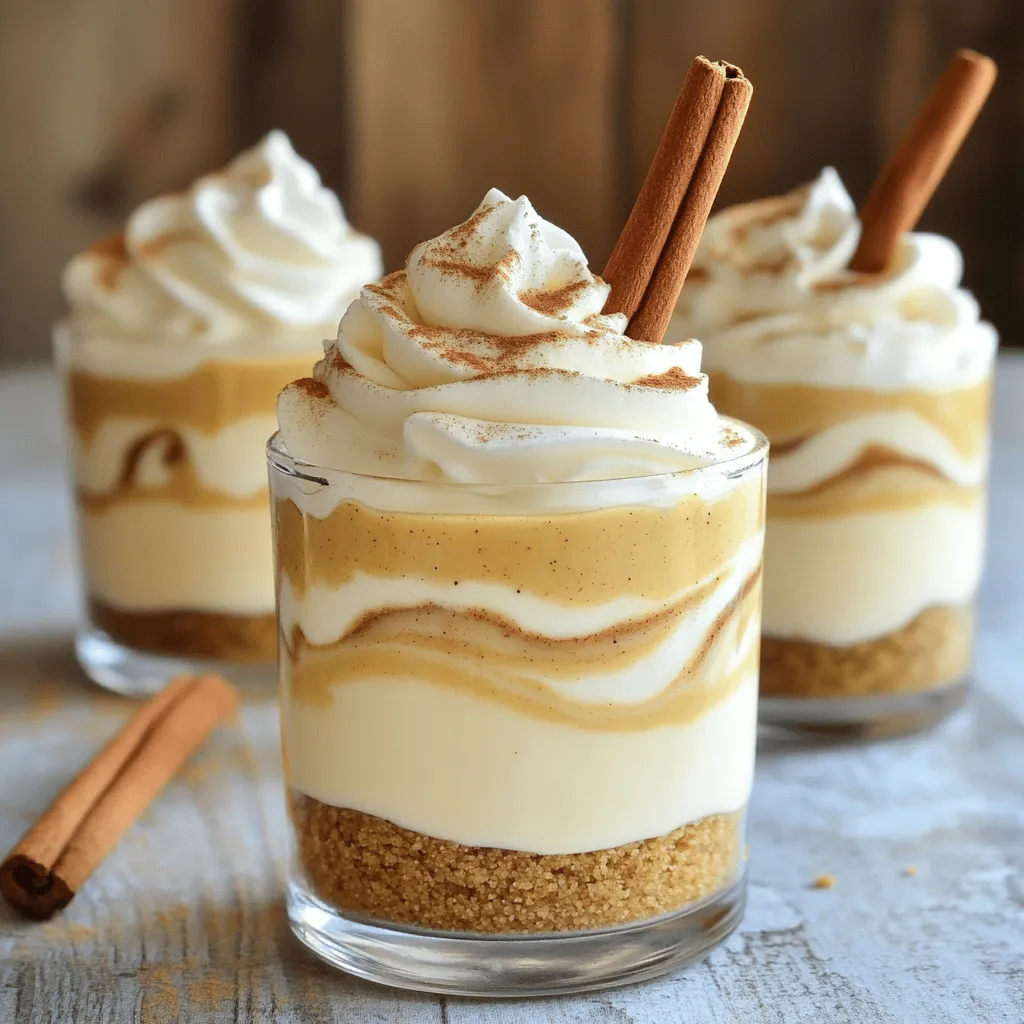 - 1 ½ cups graham cracker crumbs - ¼ cup unsalted butter, melted - 1 cup cream cheese, softened - ½ cup powdered sugar - 1 cup heavy cream, cold - 1 teaspoon vanilla extract - ½ teaspoon ground nutmeg - ½ teaspoon ground cinnamon - Whipped cream, for topping - Cinnamon sticks, for garnish (optional) When measuring ingredients, use dry measuring cups for solids. Pack the graham cracker crumbs lightly. For cream cheese, it should feel soft but not runny. Always use fresh heavy cream for the best whipped texture. For spices, use fresh ground nutmeg and cinnamon for full flavor. They make a big difference. Make sure your butter is unsalted to control salt levels in your dessert. If you don't have graham crackers, use vanilla wafers or crushed cookies. For butter, coconut oil works well as a dairy-free option. If you want to make it lighter, swap cream cheese for Greek yogurt. You can use maple syrup instead of powdered sugar for a different sweetness. Need a dairy-free option? Try using a dairy-free cream cheese and coconut cream for the whipped part. First, grab a medium bowl. Mix 1 ½ cups of graham cracker crumbs with ¼ cup of melted unsalted butter. Stir well until the crumbs are coated. They should look like wet sand. Next, take 2 tablespoons of the crumb mixture. Press it down firmly into the bottom of each cup or glass. Make sure it is compact. This gives a strong base for your cheesecake. In another bowl, beat 1 cup of softened cream cheese with ½ cup of powdered sugar. Use an electric mixer on medium speed. Mix until it is smooth and creamy. You want no lumps in this mixture. Now, pour 1 cup of cold heavy cream into a clean bowl. Use a hand mixer or stand mixer with a whisk attachment. Whip the cream until soft peaks form. Be careful not to over-whip. You want it light and airy. With a spatula, gently fold the whipped cream into the cream cheese mixture. Use a light hand. This keeps the fluffy texture of the whipped cream. Next, add 1 teaspoon of vanilla extract, ½ teaspoon of ground nutmeg, and ½ teaspoon of ground cinnamon. Gently fold these into the mixture until it is evenly blended. Using a spoon or piping bag, fill each cup with the cheesecake mixture. Layer it over the crust. Fill the cups to your desired height. Leave some space for the whipped cream on top. Cover the cups with plastic wrap. Place them in the fridge for at least 4 hours, or overnight if you can. This helps the cheesecake to set and the flavors to mix well. Right before serving, top each cup with whipped cream. Sprinkle a little nutmeg or cinnamon on top for extra flavor. You can also add a cinnamon stick for a fun garnish. To make your no-bake eggnog cheesecake cups shine, follow these tips: - Use Room Temperature Cream Cheese: This helps avoid lumps in your mixture. - Chill Your Bowls: If you chill your mixing bowls before whipping cream, your cream will whip better. - Gentle Folding: Always fold whipped cream into your cream cheese mixture gently. This keeps it light and fluffy. Sometimes, things don’t go as planned. Here’s how to fix common problems: - Lumpy Cheesecake: If your mixture is lumpy, it’s likely the cream cheese was too cold. Always soften it to room temperature. - Runny Cheesecake: If your mixture doesn't set, it may not have chilled long enough. Ensure you refrigerate for at least four hours. - Crust Falling Apart: If the crust crumbles, you may need more melted butter. It should stick together like wet sand. Pairing makes every dessert better. Here are a few ideas to enhance your cheesecake cups: - Garnish Generously: Top with whipped cream and a dusting of nutmeg or cinnamon for extra flavor. - Add a Cinnamon Stick: This adds a fun touch and a subtle flavor boost. - Serve with Coffee or Tea: The warm drink balances the cool, sweet cheesecake perfectly. {{image_4}} You can change the flavor of your no-bake eggnog cheesecake cups. For a twist, try using pumpkin spice instead of nutmeg and cinnamon. This gives a warm, autumn taste perfect for fall. You can switch up the vanilla extract with almond extract for a nutty flavor. You could even try adding a splash of rum extract for an extra kick, staying true to classic eggnog vibes. If you need a dairy-free version, use vegan cream cheese and coconut cream instead of heavy cream. This keeps the texture creamy while being kinder to your tummy. You can also substitute graham cracker crumbs with gluten-free crumbs for a gluten-free treat. Just ensure that all your ingredients are labeled gluten-free for safety. Add-ins can make your cheesecake cups even more fun! Try folding in crushed ginger snaps for a spicy crunch. You can also add mini chocolate chips for a sweet surprise. For toppings, consider using crushed candy canes for a festive touch. Drizzle caramel sauce over the whipped cream for added richness. Don't forget to garnish with cinnamon sticks for a charming look! To store your no-bake eggnog cheesecake cups, cover them tightly with plastic wrap. You can also use an airtight container. This keeps them fresh and prevents odors from seeping in. Make sure to refrigerate them right after serving to maintain their creamy texture. If you want to freeze the cheesecake cups, do it before adding whipped cream. Wrap each cup tightly in plastic wrap, then in foil. This extra layer stops freezer burn. You can freeze them for up to three months. When ready to eat, let them thaw in the fridge overnight. These cheesecake cups last for about 4 days in the fridge. For the best taste, enjoy them within the first two days. The flavors meld beautifully, giving you that rich, holiday taste. If stored properly, they will maintain their creamy texture and flavors. Yes, you can use other crusts. You might try crushed cookies like Oreos or vanilla wafers. These options add unique flavors to your cheesecake cups. Just be sure to adjust the amount of butter based on your crust choice. You should chill the cheesecake cups for at least 4 hours. Chillin