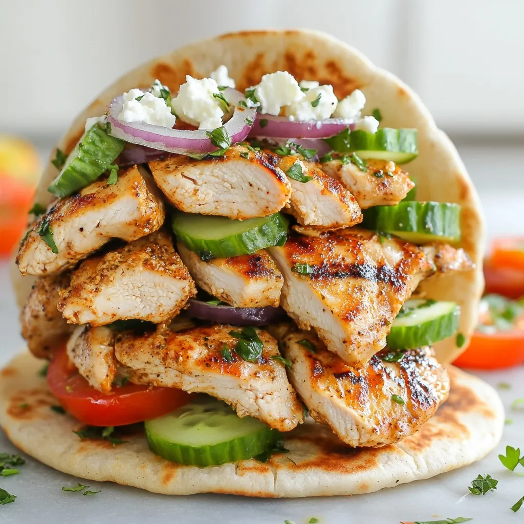 To make these flavorful gyros, gather these key ingredients: - 4 boneless, skinless chicken thighs - 2 tablespoons Greek yogurt - 2 tablespoons olive oil - 1 tablespoon fresh lemon juice - 4 cloves garlic, minced - 2 teaspoons dried oregano - 1 teaspoon ground cumin - 1 teaspoon smoked paprika - Salt and freshly ground black pepper to taste - 1 large cucumber, diced - 1 medium tomato, diced - 1 red onion, thinly sliced - 4 whole wheat pita breads These ingredients create a tasty dish full of bold flavors. You can add these for extra flavor and fun: - Fresh parsley, chopped for garnish - Crumbled feta cheese These additions give your gyros a nice touch. You will need a few simple tools to make this recipe: - Medium mixing bowl - Whisk - Large non-stick skillet - Spatula - Plate for the cooked chicken - Knife and cutting board Having these tools ready makes cooking easier and more fun. {{ingredient_image_2}} Start by making the marinade. In a medium bowl, mix Greek yogurt, olive oil, fresh lemon juice, minced garlic, dried oregano, ground cumin, smoked paprika, salt, and black pepper. Whisk them together until smooth. Add the chicken thighs and coat each piece well. Cover the bowl and place it in the fridge for at least 30 minutes. This step helps the chicken absorb all those tasty flavors. Heat a large, non-stick skillet over medium heat. Once the skillet is hot, add the marinated chicken thighs. Cook them for about 7-8 minutes on each side. Look for a golden brown color and check that the internal temperature reaches 165°F. When done, move the chicken to a plate and let it rest for 5 minutes. Then, slice it into strips. Without cleaning the skillet, add diced cucumber, diced tomato, and thinly sliced red onion. Season these with a pinch of salt and pepper. Sauté the vegetables over medium heat for about 3-4 minutes. Stir occasionally to keep them crisp but slightly soft. This mix will add fresh flavor to your gyros. While cooking the veggies, warm the whole wheat pita breads. You can place them in a dry skillet over low heat or microwave them for 15-20 seconds. This makes them soft and easy to fill. Now comes the fun part! Take a warmed pita and fill it with a generous amount of sautéed vegetables. Add the sliced chicken on top. For extra flavor, sprinkle crumbled feta cheese and garnish with fresh chopped parsley. This makes each bite colorful and tasty. Serve the gyros warm on a wooden board or platter. Add lemon wedges for a zesty touch. You can also include extra diced cucumber and tomato on the side. This gives your meal a fresh crunch and looks great on the table. To make your chicken gyros burst with flavor, the marinade is key. Use fresh ingredients like garlic, lemon juice, and Greek yogurt. Mix them well in a bowl. Add dried oregano, ground cumin, and smoked paprika for depth. The salt and black pepper enhance the taste. Marinate the chicken for at least 30 minutes. If you have time, marinate it overnight. This will give the chicken a rich flavor. When cooking your chicken, use a large non-stick skillet. This helps the chicken brown nicely. Heat the skillet over medium heat. Cook each side for about 7-8 minutes. Make sure the chicken reaches 165°F (75°C). This ensures it is safe to eat. After cooking, let the chicken rest for 5 minutes before slicing. This keeps the juices inside, making it tender. How you present your gyros can impress your guests. Use a wooden board or a nice platter for serving. Arrange the chicken strips and veggies in the pita neatly. Add crumbled feta cheese on top for a pop of flavor. Garnish with fresh parsley for a touch of color. Serve with lemon wedges on the side. This adds a zesty touch and looks great too! Pro Tips Marinate for Maximum Flavor: Allow the chicken to marinate for at least 1 hour, or even overnight, for deeper flavor and tenderness. Keep the Skillet Hot: Ensure your skillet is properly heated before adding the chicken; this helps achieve a nice sear and prevents sticking. Use Fresh Ingredients: Opt for fresh vegetables and herbs to enhance the taste and nutritional value of your gyros. Customize Your Fillings: Feel free to add other toppings like olives, bell peppers, or tzatziki sauce to personalize your gyros. {{image_4}} If you want to switch things up, try using other proteins. Lamb is a classic choice for gyros. It adds a rich flavor. Turkey is another lean option that works well. You can also use tofu for a vegetarian twist. Just marinate it like the chicken. Another great protein is shrimp. It cooks quickly and pairs nicely with the flavors. For a vegetarian meal, use chickpeas or lentils. Both have great texture and soak up flavor. You can also use grilled halloumi cheese. It offers a nice salty touch. Stuff the pita with roasted vegetables, like zucchini or bell peppers. This adds a sweet and smoky taste. Don’t forget to top it with tzatziki made from Greek yogurt and cucumber. Feel free to mix up the vegetables in your gyros. Try adding bell peppers for crunch and color. Spinach or arugula can add a fresh taste. You might also like using shredded carrots for a bit of sweetness. Experiment with different herbs, like dill or mint, to change the flavor. Each combination gives a new twist on the classic dish. Store leftover gyros in an airtight container. Keep them in the fridge for up to three days. To keep the pita fresh, wrap it in foil or plastic wrap. To reheat, use a skillet over medium-low heat. This keeps the pita soft and warm. You can also microwave the filling for about 30 seconds. Make sure to cover it to avoid drying out. You can freeze the chicken and veggies separately. Use freezer bags to prevent freezer burn. Store for up to three months. Thaw in the fridge overnight before reheating. You can marinate chicken for gyros for at least 30 minutes. For best flavor, try to marinate for up to 2 hours. This time allows the spices and yogurt to soak into the meat. If you have more time, you can even marinate it ov
