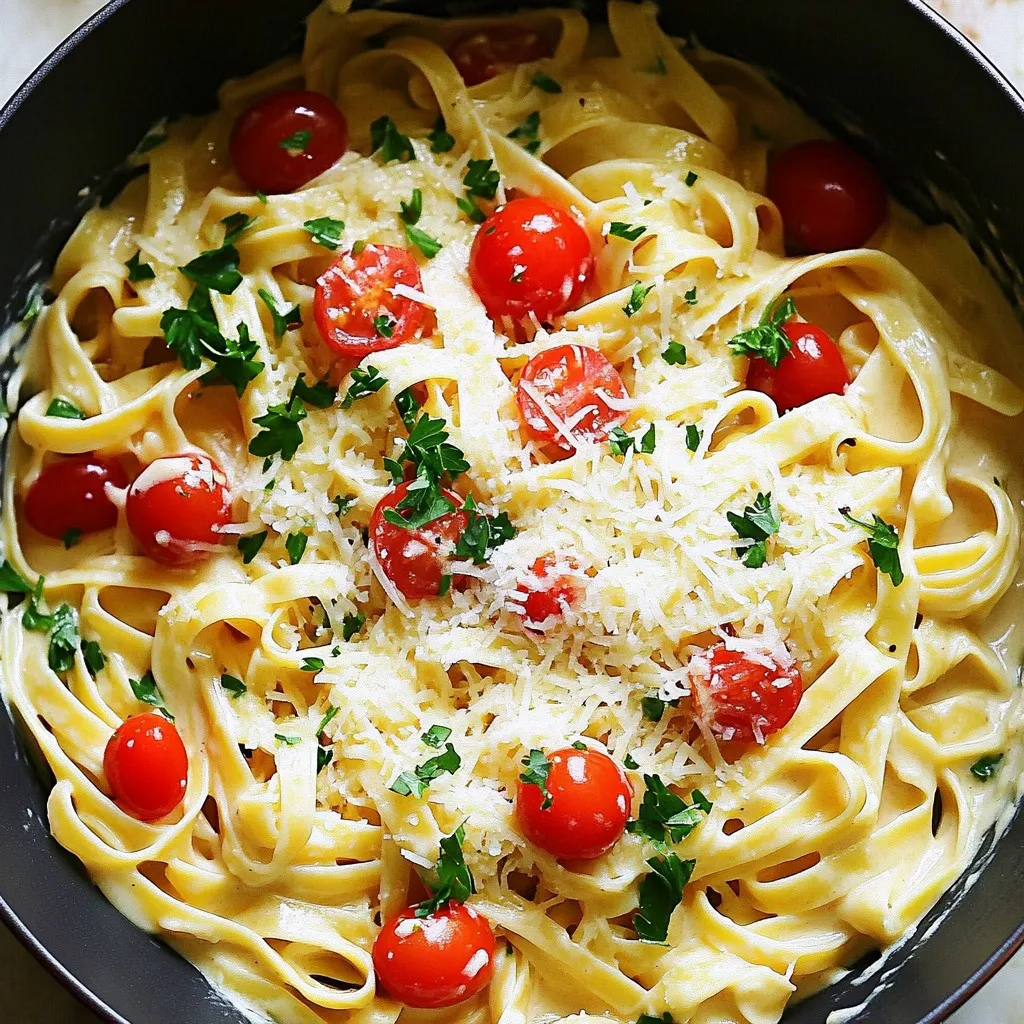 - 8 oz fettuccine or spaghetti - 4 cups vegetable broth - 1 cup heavy cream - 1 cup freshly grated Parmesan cheese - 4 cloves garlic, minced - 1 tablespoon olive oil - 1 teaspoon onion powder - 1 teaspoon Italian seasoning - Salt and pepper to taste - Fresh parsley, chopped - 1 cup cherry tomatoes, halved Gathering your ingredients is the first step to making this dish. Start with the pasta. You can use fettuccine or spaghetti. Both will work well. Next, grab four cups of vegetable broth. This will add great flavor to the pasta. You will also need one cup of heavy cream. This makes the sauce rich and creamy. Now, let’s talk cheese! You need one cup of freshly grated Parmesan cheese. This is key for that delightful cheesy flavor. For seasoning, you will need four cloves of minced garlic. This gives a wonderful aroma and taste. Add one tablespoon of olive oil to sauté the garlic. You’ll also use one teaspoon each of onion powder and Italian seasoning. Don't forget salt and pepper to taste. Lastly, fresh parsley will add color and a nice touch when serving. If you want to add a burst of flavor, cherry tomatoes are a great option. Halve them and toss them in for a pop of freshness. With all these ingredients ready, you're on your way to creating a delicious one-pot meal! - Warm 1 tablespoon of olive oil in a large pot over medium heat. - Add 4 cloves of minced garlic and sauté for about 1 minute until fragrant. - Pour in 4 cups of vegetable broth and bring it to a gentle boil. - Once the broth bubbles, add 8 oz of fettuccine or spaghetti to the pot. - Cook the pasta according to the package instructions, usually about 9-11 minutes. Stir occasionally to keep it from sticking. - Lower the heat and stir in 1 cup of heavy cream and 1 cup of freshly grated Parmesan cheese. - Add 1 teaspoon of onion powder, 1 teaspoon of Italian seasoning, and salt and pepper to taste. - Mix well until the cheese melts and the sauce thickens, about 2-3 minutes. - If you like, fold in 1 cup of halved cherry tomatoes for a fresh touch. - Taste and adjust seasoning as needed. - Serve the pasta hot, garnished with chopped parsley for a pop of color. To get that perfect al dente pasta, cook it until it is firm but not hard. Fettuccine or spaghetti will take around 9 to 11 minutes in boiling broth. Stir it often to keep it from sticking together. A good rule is to taste the pasta a minute or two before the time is up. This way, you can catch it at just the right moment. To thicken your sauce, let it simmer for a few extra minutes after adding the cream and cheese. The heat will help it come together nicely. Use freshly grated Parmesan cheese instead of pre-grated. Fresh cheese melts better and adds a richer flavor to your dish. Pair your pasta with a light salad or garlic bread for a full meal. A simple green salad with lemon dressing balances the creaminess well. For drinks, a glass of white wine, like Pinot Grigio, goes nicely with this dish. It refreshes your palate and enhances the flavors of the pasta. {{image_4}} You can switch up the pasta type. Whole wheat or gluten-free pasta works well. These options add unique flavors and textures. You can also try different shapes like penne or rotini. For cream, consider using coconut milk or cashew cream. These choices make the dish lighter and dairy-free. They also add a different taste that can be fun to try. Adding protein can make your dish heartier. Chicken or shrimp pairs nicely with the creamy sauce. Simply cook them in the pot before adding the pasta. This adds flavor and makes the meal more filling. You can add vegetables for extra nutrition. Spinach, peas, or bell peppers blend well into the sauce. They add color and health benefits. Just toss them in with the pasta during the last few minutes of cooking. To make this dish gluten-free, use gluten-free pasta. Check that your broth and cheese are also gluten-free. This way, everyone can enjoy it. For dairy-free options, you can use nut-based cheese. Almond or cashew cheese melts well and gives a creamy texture. You can also replace heavy cream with almond or oat milk. These swaps keep the dish rich and tasty without dairy. To keep your One Pot Creamy Garlic Parmesan Pasta fresh, follow these tips: - Cool it down: Let the pasta cool to room temperature before storing. - Use airtight containers: Store the pasta in airtight containers to prevent drying out. - Refrigerate promptly: Place the containers in the fridge within two hours of cooking. This helps keep the pasta tasty for up to three days. To reheat your pasta without losing its creaminess, do the following: - Add moisture: When reheating, add a splash of milk or cream. - Use low heat: Warm the pasta on the stove over low heat. Stir frequently to avoid sticking. This keeps the sauce smooth and creamy. Avoid microwaving it too long, as it may overcook the pasta. Yes, you can freeze One Pot Creamy Garlic Parmesan Pasta! Here’s how: - Cool completely: Ensure the pasta is cool before freezing. - Use freezer-safe containers: Store in containers or freezer bags, removing as much air as possible. To thaw and reheat: - Thaw in the fridge: Leave it in the fridge overnight before reheating. - Reheat gently: Warm it on the stove with a bit of added cream or broth, stirring often. This method helps maintain flavor and texture. Enjoy your creamy pasta later! - How can I make this dish vegan? To make this dish vegan, swap heavy cream for a plant-based cream. You can use coconut cream or cashew cream. For cheese, try nutritional yeast or a vegan Parmesan. This way, you keep the creamy texture and flavor. - What can I use instead of heavy cream? If you want to skip heavy cream, you can use half-and-half or whole milk. These options will give you a lighter sauce. You can also try a mix of vegetable broth and a starch, like cornstarch, to thicken it. - Can I make this dish ahead of time? Yes, you can make this dish ahead of time. Cook it fully and let it cool. Store it i