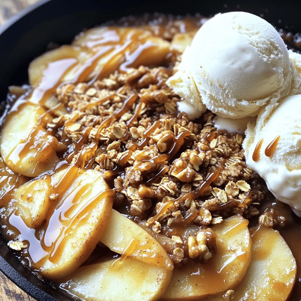 - 4 large apples, peeled, cored, and sliced into thin wedges - 1 tablespoon lemon juice - 1 teaspoon ground cinnamon - ½ cup packed brown sugar - 1 tablespoon all-purpose flour - 1 cup rolled oats - ½ cup all-purpose flour - ½ cup cold unsalted butter, cubed into small pieces - 1 teaspoon pure vanilla extract - ½ cup chopped walnuts (optional) - ½ cup caramel sauce - Ice cream for serving (optional) To make this skillet caramel apple crisp, you need fresh apples. I like to use large, firm apples. You want apples that will hold their shape when baked. Next, the dry ingredients and spices add flavor. Ground cinnamon gives warmth, while brown sugar adds sweetness. For the topping, rolled oats create a chewy texture. Flour makes it crispy. Cold butter binds everything together. If you want crunch, add walnuts. Finally, caramel sauce brings a rich sweetness. Ice cream pairs perfectly for a warm dessert. Gather these ingredients, and you are on your way to a delicious treat! Preheating your oven to 350°F (175°C) is key. A hot oven helps the crisp bake evenly. This step ensures the topping turns golden and the apples bubble nicely. While the oven heats, you can prep the apples. In a large bowl, mix the sliced apples with lemon juice, ground cinnamon, brown sugar, and flour. Toss gently so the apples get coated well. Let this mixture sit for about 10 minutes. This wait time helps the apples soften and absorb flavor. Heat a large, oven-safe skillet on medium heat. Pour in the apple mixture. Cook for about 5-7 minutes, stirring often. The apples should start to soften but still hold some crunch. Once they’re tender, take the skillet off the heat. In a separate bowl, mix rolled oats, flour, brown sugar, and cold butter cubes. Use your fingers or a pastry cutter to combine until it looks like coarse crumbs. If you like, stir in chopped walnuts for added crunch. Spread the warm apple mixture evenly in the skillet. Then, sprinkle the oat topping generously over the apples. Make sure the topping covers all the apples for even baking. Carefully move the skillet to the preheated oven. Bake for 25-30 minutes. Look for a golden brown topping and bubbling apples around the edges. This means your dish is ready. As soon as you take the skillet out, drizzle caramel sauce over the hot crisp. Timing is important here. Let it cool slightly for the flavors to mix well. Scoop generous portions into bowls. For a fun twist, add a scoop of ice cream on top. The warm crisp and cold ice cream create a delightful contrast. You can also garnish with extra cinnamon or walnuts for a pretty finish. When it comes to making a great apple crisp, the type of apples you choose matters. I like using a mix of sweet and tart apples. Some good choices include: - Granny Smith: tart and holds shape well - Honeycrisp: sweet and juicy - Fuji: crisp and slightly sweet Make sure the apples are ripe. A ripe apple has a nice color and feels firm but not hard. If they are too soft, they may turn mushy in the oven. The topping is key to a delicious apple crisp. You can add flavor in many ways. Here are some ideas: - Add spices like nutmeg or allspice for warmth. - Mix in some brown sugar for extra sweetness. - Use different nuts, like pecans or almonds, instead of walnuts. If you have dietary needs, you can make swaps. Use coconut oil instead of butter for a dairy-free option. You can also use gluten-free oats and flours to keep it gluten-free. To make your caramel apple crisp even better, serve it with ice cream. The cold ice cream melts into the warm crisp, creating a great mix. Here are some other ideas for serving: - Top with whipped cream for extra richness. - Serve with a side of caramel sauce for dipping. - Pair with a hot drink, like cider or coffee, for a cozy touch. {{image_4}} You can make this dish gluten-free easily. Swap the all-purpose flour for almond flour or oat flour. These flours work well and keep the crisp texture. You can also use certified gluten-free oats for the topping. When mixing the apple ingredients, ensure all items are gluten-free. This way, everyone can enjoy the dish. Want to make this recipe vegan? Replace the butter with coconut oil or vegan butter. Both options will keep it rich and tasty. You can also use maple syrup instead of brown sugar for sweetness. This keeps the dish sweet while adding a hint of flavor. Use non-dairy ice cream for serving if desired, ensuring everyone can enjoy a scoop. If you have nut allergies, just skip the walnuts. You can add sunflower seeds or pumpkin seeds instead. They provide crunch without the nut allergy risk. For the topping, using rolled oats alone offers a nice texture. This way, everyone can enjoy the sweet, caramel goodness without worry. To keep your skillet caramel apple crisp fresh, place it in an airtight container. Use a glass or plastic container with a tight lid. This helps prevent air from getting in and keeps it tasty. It's best to store it in the fridge. Make sure it cools down first before sealing it up. This way, it won’t create steam inside the container. When you want to enjoy your leftovers, you can reheat them in the oven. Preheat the oven to 350°F (175°C). Place the crisp in an oven-safe dish and cover it with foil. Heat for about 15-20 minutes until warm. This method keeps the topping crunchy. You can also use a microwave, but it may soften the crisp. Heat it in short bursts of 30 seconds until hot. To freeze your caramel apple crisp, let it cool completely. Then, place it in a freezer-safe container. You can also wrap it tightly in plastic wrap, then aluminum foil. This helps protect it from freezer burn. It will last for up to three months in the freezer. When you're ready to eat it, move it to the fridge to thaw overnight. After thawing, reheat in the oven for the best texture. Yes, you can use other fruits. Pears, peaches, or berries work well. Just keep the amount the same, about four cups total. Adjust the sugar based on the frui