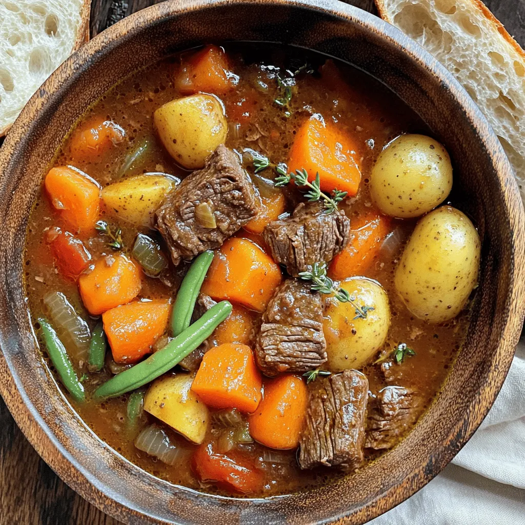 - 2 lbs beef chuck, cut into 1-inch cubes - 4 medium carrots, sliced into thick rounds - 3 medium potatoes, peeled and diced into 1-inch pieces - 1 large onion, chopped - 3 cloves garlic, minced - 1 cup green beans, trimmed and cut into 1-inch pieces - 4 cups beef broth - 1 can (14.5 oz) diced tomatoes, undrained - 2 tablespoons tomato paste I love the base of this stew. The beef chuck gives it a rich flavor. The carrots and potatoes add both sweetness and heartiness. The green beans bring a nice crunch. - 2 teaspoons dried thyme - 1 teaspoon dried rosemary - 1 bay leaf - Salt and pepper to taste Seasonings are key. Dried thyme adds earthiness. Dried rosemary gives a fresh taste. The bay leaf enhances the stew while cooking. - 2 tablespoons olive oil for searing - Optional garnishes like fresh parsley I always sear the beef in olive oil first. This step locks in flavor and gives a lovely brown color. Fresh parsley as a garnish brightens up the dish. It’s a simple touch that looks great. Searing the beef is key to great flavor. It helps build a rich, deep taste. Start by heating olive oil in a large skillet over medium heat. Once hot, add the beef cubes. Sear them for about 5-7 minutes. Make sure they are browned on all sides. This step locks in juices and adds a nice crust. Remember, browning the beef cubes matters. It adds layers of flavor that make the stew taste amazing. Now it’s time to layer your ingredients in the slow cooker. Place the browned beef in first. Next, add the sliced carrots, diced potatoes, chopped onion, minced garlic, and cut green beans. Stir everything together gently. This mix ensures every bite is filled with flavor. For the sauce, combine beef broth, diced tomatoes, and tomato paste in a bowl. Add dried thyme, dried rosemary, and the bay leaf. Season with salt and pepper to taste, then mix well. Make sure the tomato paste is fully dissolved before pouring. Once your sauce is ready, pour it over the beef and veggies. Ensure all ingredients are submerged in the liquid. This helps the flavors meld beautifully as they cook. You can choose between low and high cooking settings. Cooking on low for 8 hours gives the best tenderness. If you're short on time, cook on high for about 4 hours. Either way, the beef will become tender and the veggies soft. Keep the lid on during cooking. This keeps all the steam inside, making your stew rich and hearty. Enjoy the delicious smells wafting through your kitchen as it cooks! To make your stew even better, add extra herbs. You can try adding fresh parsley or a sprig of thyme. For a kick, add a pinch of cayenne or smoked paprika. These spices can bring new life to your stew. If you want a thicker stew, there are a few easy tricks. You can mix a little cornstarch with cold water and stir it in. Let it cook for a bit longer to thicken. Another way is to mash some of the potatoes in the pot. This will create a nice, creamy texture without adding extra steps. Pair your hearty beef veggie stew with crusty bread. It’s perfect for mopping up that rich broth. A fresh side salad with a light vinaigrette also works well for balance. For a nice touch, garnish each bowl with fresh parsley. A drizzle of olive oil can make it shine. Use colorful bowls to make the dish pop. A well-presented meal looks inviting and makes everyone want to dig in. One common mistake is overcrowding the slow cooker. If you add too many ingredients, they won’t cook evenly. Stick to the recipe amounts for the best results. Another mistake is skipping the searing step. Browning the beef first adds rich flavor. This step is key for a deep, comforting taste. Take the time to sear the beef, and you will taste the difference. {{image_4}} You can easily change the veggies in this stew. If you have other favorites, try them! Sweet potatoes or parsnips work well. You can also add bell peppers for a pop of color. Just remember to cut them into similar sizes. This helps everything cook evenly. For beef, you can use other cuts besides chuck. Brisket or round can be great choices too. Each cut offers its own flavor and texture. Just make sure to adjust cooking times if you switch cuts. To make a gluten-free stew, choose gluten-free broth. Most store-bought options work well. You can also skip the tomato paste if it has gluten. This keeps the dish safe for those with gluten allergies. For a lighter version, use lean cuts of beef. You can also add more vegetables and less meat. This way, you keep the stew hearty without all the calories. Want to add a global touch? Try spices like cumin or paprika. These can give your stew a warm flavor. You can also add a bit of chili powder for some heat! Incorporating regional ingredients can also change the flavor. For an Italian twist, add some diced zucchini and basil. Or, for a Mexican spin, toss in corn and cilantro. Each option brings a new taste to your comforting stew. To store leftover stew in the fridge, let it cool first. Transfer the stew to an airtight container. This keeps moisture in and air out. Label the container with the date. Store it in the fridge for up to three days. To maintain flavor and freshness, reheat only what you plan to eat. This stops the stew from breaking down too much. To properly freeze stew, let it cool completely. Pour the stew into freezer-safe bags or containers. Leave some space at the top for expansion. Seal tightly and label with the date. You can freeze it for up to three months. For reheating once thawed, place it in a pot over low heat. Stir often until it is heated through. You can also use a microwave. Just be sure to stir it halfway through. In the fridge, the stew lasts about three days if stored well. In the freezer, it can be kept for three months. After thawing, use it within three days for the best taste. Always check for any off smells or changes in texture before eating. Yes, you can use frozen beef in this stew. Just remember a few tips: - Thaw first: If you can, thaw the beef in 