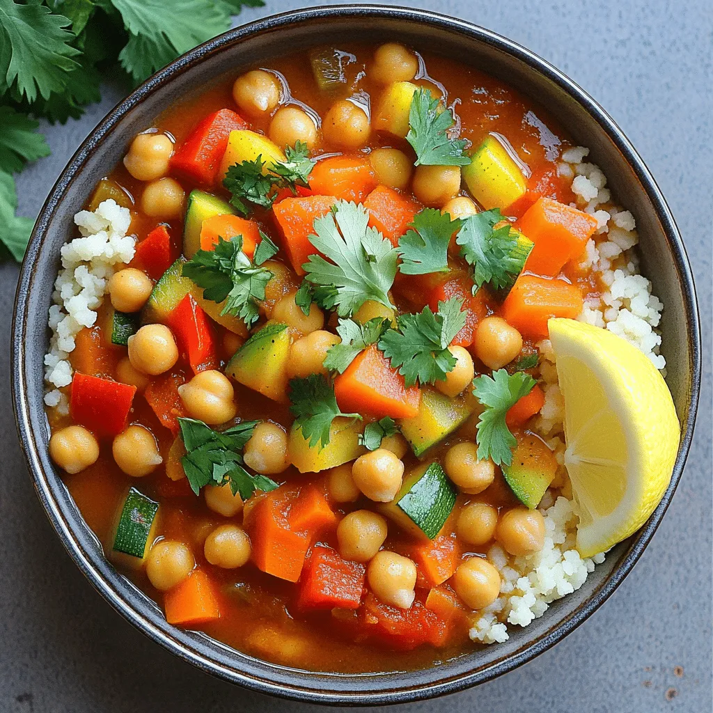 - 2 cups canned chickpeas, thoroughly drained and rinsed - 1 cup couscous - 1 large onion, finely chopped - 2 cloves of garlic, minced - 2 medium carrots, diced into small pieces - 1 red bell pepper, chopped into cubes - 1 medium zucchini, diced In this Moroccan chickpea couscous stew, chickpeas form the heart of the dish. They add protein and a nice texture. Couscous serves as the fluffy base, soaking up all the wonderful flavors. The mix of vegetables—onion, garlic, carrots, bell pepper, and zucchini—brings color and nutrition. Each one adds its unique taste, making every bite exciting. - 2 teaspoons ground cumin - 1 teaspoon ground coriander - 1 teaspoon ground cinnamon - 1 teaspoon ground turmeric - 1/2 teaspoon cayenne pepper (or more, based on your preferred spice level) The spices are what make this dish special. Ground cumin adds warmth, while coriander brings a hint of citrus. Cinnamon adds a sweet note, and turmeric offers earthiness. Cayenne pepper gives it a kick, so adjust this based on your spice tolerance. The blend creates a fragrant aroma that fills your kitchen as it cooks. - 1 can (14 oz) diced tomatoes, including juice - 4 cups vegetable broth - 1/4 cup raisins or sultanas - Fresh cilantro or parsley, for garnishing - Lemon wedges, for serving Canned tomatoes add a rich, tangy flavor that brightens the stew. Vegetable broth serves as the liquid base, making the stew hearty without being heavy. Raisins or sultanas introduce a sweet contrast to the spices. Garnishing with fresh herbs like cilantro or parsley adds a burst of color and freshness. Finally, lemon wedges provide a zesty finish, enhancing the overall flavor. Start by placing the chopped onion and minced garlic at the bottom of the slow cooker. This creates a strong base. The onion adds sweetness, while the garlic brings depth to the flavor. Next, carefully add the diced carrots, red bell pepper, and zucchini. Mix these vegetables with the onion and garlic. This step ensures that every bite has a mix of flavors. Now, it’s time to incorporate the chickpeas and tomatoes. Pour in the drained chickpeas along with the diced tomatoes, including their juice. Stir everything well to combine. Now for the fun part—seasoning! Sprinkle in the ground cumin, coriander, cinnamon, turmeric, and cayenne pepper. Don’t forget salt and black pepper. Stir the mixture well to coat all the veggies and chickpeas. Then, pour in the vegetable broth. This helps all the ingredients soak up flavors. Cover the slow cooker and set it to cook on low for 6-8 hours or high for 3-4 hours. About 30 minutes before serving, stir in the couscous and raisins. This allows the couscous to soak up the broth and expand. Once done, taste the stew. Adjust the seasoning if needed. You might want more salt, pepper, or spices. Enjoy this colorful, tasty dish! - Using fresh herbs: Fresh herbs like cilantro or parsley add bright notes. Sprinkle them just before serving to keep the flavors vibrant. - Adjusting spice levels: If you like heat, add more cayenne pepper. For milder taste, reduce the cayenne. Always taste as you go to suit your palate. - Presentation tips with garnishes: Ladle the stew into bowls. Top with fresh herbs for color and zest. A squeeze of lemon juice brightens the dish. - Pairing options: Serve with crusty bread or a fresh salad. This adds texture and balances flavors. - Time adjustments based on cooker's model: Each slow cooker is different. Check your model’s manual for cooking time tips. Some cookers cook faster than others. - Importance of keeping the lid closed: Keeping the lid on helps the stew cook evenly. Opening the lid lets heat escape and slows cooking. {{image_4}} You can easily change the veggies in this stew. Use what’s fresh and in season. Try adding sweet potatoes for a twist. Kale or spinach can also boost nutrition. You can swap out the red bell pepper for green or yellow ones. This way, you keep it colorful and fun! If you're not a fan of couscous, there are great choices. Quinoa works well and adds protein. It’s light and fluffy when cooked. Barley is another option; it adds a nice chewy texture. Both grains absorb flavors beautifully, making your stew even tastier. Want more protein? Lentils are a great addition. They cook well and soak up all the spices. You can also use different beans, like black or kidney beans. They add creaminess and enhance the dish. Mix and match to find your favorite combo! Store leftovers in an airtight container. This keeps the stew fresh and tasty. Let it cool down first before sealing. You can keep it in the fridge for up to five days. When reheating, add a splash of broth to bring back moisture. You can freeze portions for later use. Divide the stew into freezer-safe bags or containers. Make sure to remove excess air before sealing. It can last in the freezer for up to three months. To reheat, let it thaw overnight in the fridge. Then warm it on the stove over low heat until hot. The stew stays good in the fridge for five days. In the freezer, it lasts for three months. Look for signs of spoilage, like off smells or changes in color. If it seems off, it's best to toss it. Cooking times in a slow cooker vary. If you set it to low, it takes about 6-8 hours. On high, expect 3-4 hours. Both methods make the stew tasty and warm. Yes, you can add meat! Chicken or lamb works well here. Just cut them into small pieces. Add them at the start with the veggies to ensure they cook fully. No, regular couscous contains gluten. If you need a gluten-free option, try quinoa or rice. Both will soak up the flavors just like couscous. You have learned how to make a flavorful slow-cooker dish using simple ingredients. We explored key components like chickpeas, vegetables, and spices that create a rich taste. Remember to adjust flavors and try variations to suit your needs. Proper storage will keep your leftovers fresh for later enjoyment. Cooking in a slow cooker allows easy meal prep. This d
