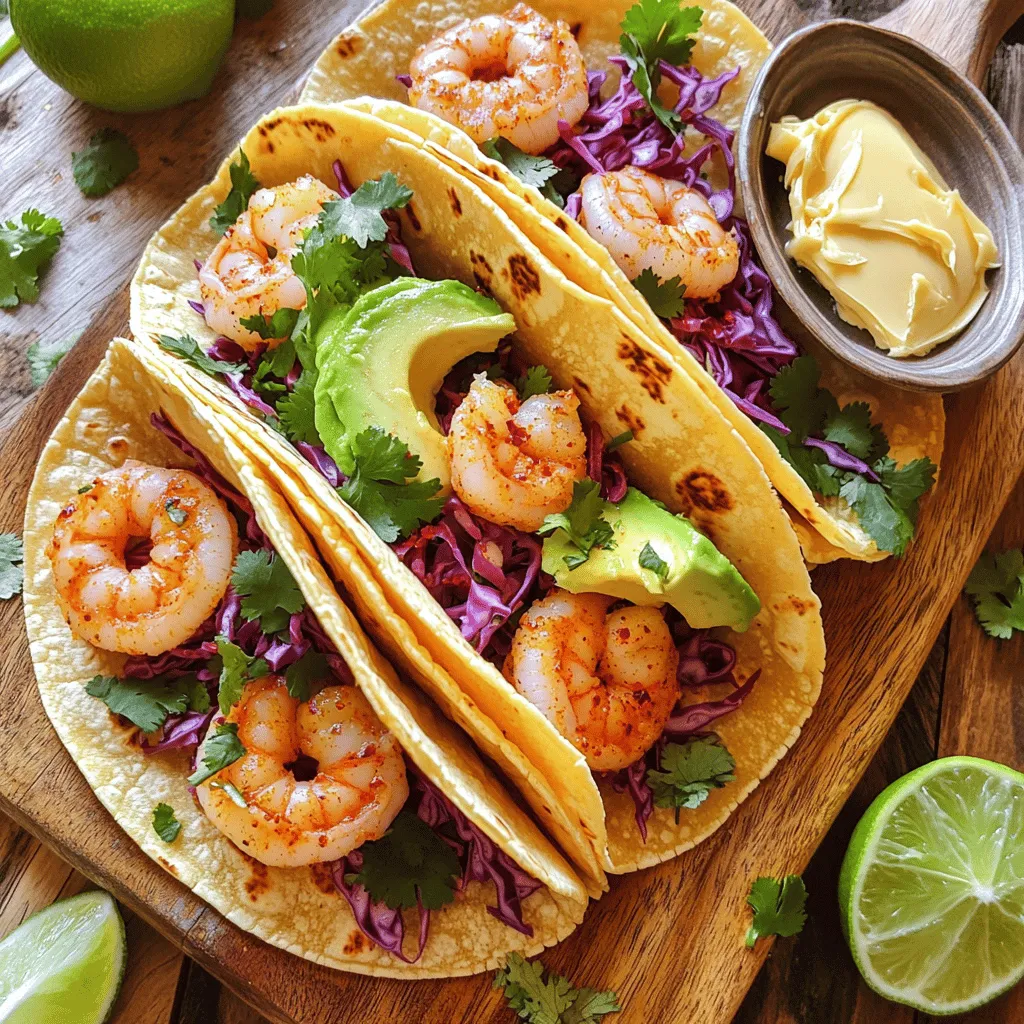 Once your shrimp is ready, remove it from the heat. Now it’s time to build your tacos! Place a good amount of shrimp on each warm tortilla. Add a handful of finely shredded red cabbage for some crunch. Then, layer a few slices of ripe avocado on top for creaminess. Squeeze fresh lime juice over each taco. Finally, sprinkle chopped cilantro for a fresh touch. Serve your tacos with extra lime wedges on the side for more zest with every bite.