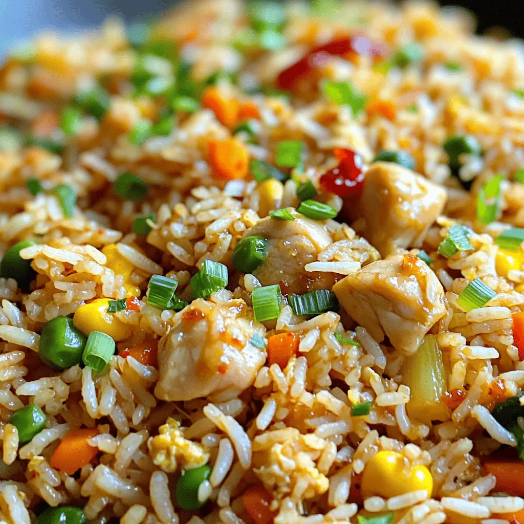 The main ingredients for this dish include cooked jasmine rice, diced chicken, and minced garlic. Using jasmine rice gives the fried rice a lovely aroma and a fluffy texture. The chicken provides protein, making it a filling meal. Garlic adds a strong, savory flavor.