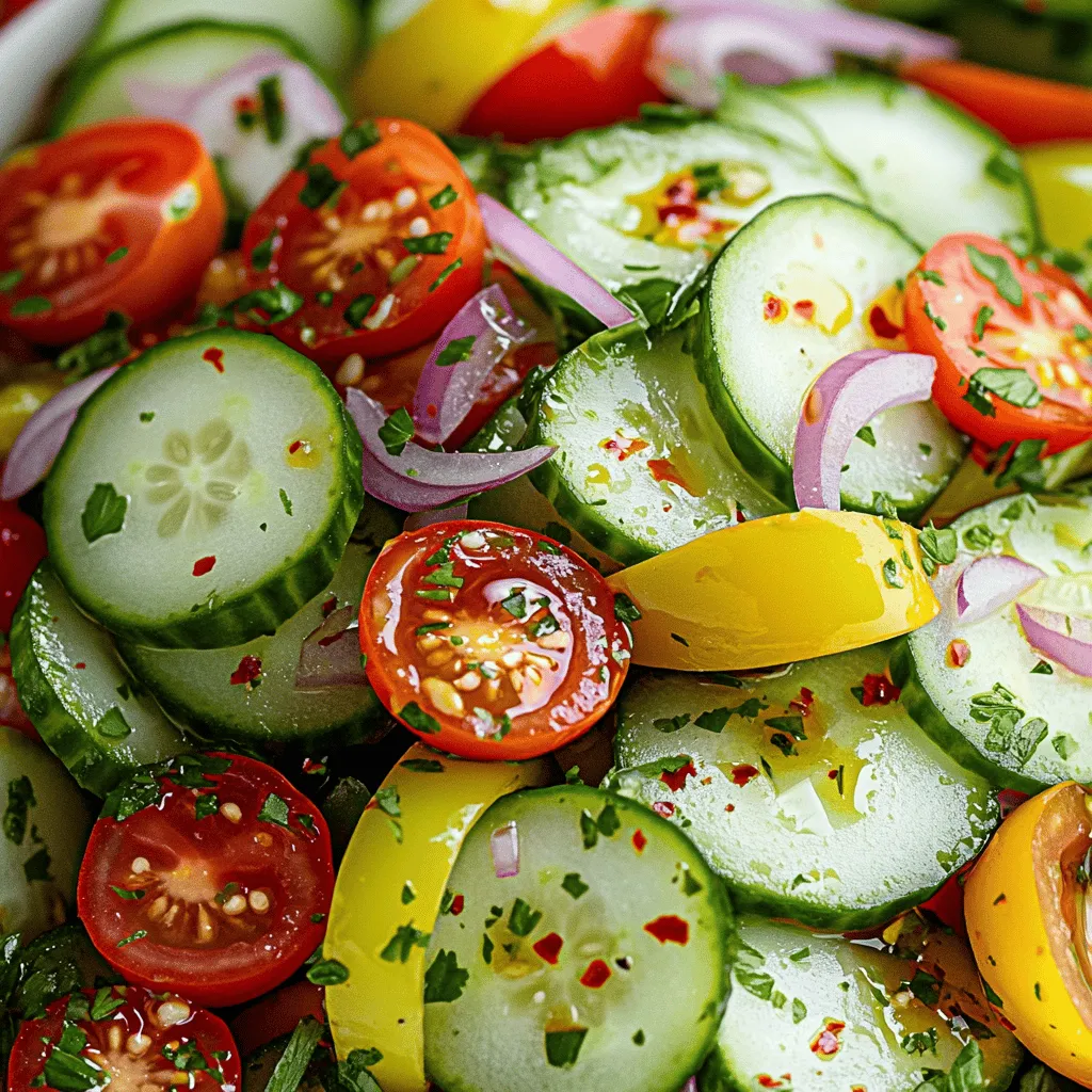 The TikTok Cucumber Bell Pepper Salad is colorful and packed with flavor. Here’s what you need to make this fresh dish: - 2 large cucumbers, thinly sliced into rounds - 2 bell peppers (1 red and 1 yellow), julienned for a vibrant look - 1 small red onion, paper-thin slices - 1 cup cherry tomatoes, halved to showcase their juicy interiors - 1/4 cup fresh cilantro, finely chopped for a burst of flavor - Juice of 2 limes for a zesty kick - 3 tablespoons high-quality extra virgin olive oil - 1 teaspoon honey (or replace with agave syrup for a vegan option) - Salt and pepper to taste - 1/2 teaspoon chili flakes (optional, to add a bit of heat) Each ingredient adds its own special touch. The cucumbers give crunch, while bell peppers add sweetness. Red onion brings a sharp bite, and cherry tomatoes add a burst of juice. Fresh cilantro brightens the taste, and lime juice gives a refreshing kick. Olive oil helps blend all the flavors, and honey adds a hint of sweetness. Finally, seasoning ties everything together. Gather these items, and you'll be ready to create a salad that not only looks good but also tastes amazing! Start by washing the cucumbers under cold water. Make sure to scrub them well. Slice the cucumbers into thin rounds. This gives each bite a nice crunch. Next, take the bell peppers. I like to use one red and one yellow for color. Julienne the bell peppers into thin strips. Then, slice the red onion into very thin pieces. Finally, cut the cherry tomatoes in half. This shows off their juicy insides. In a large salad bowl, combine the sliced cucumbers, julienned bell peppers, thinly sliced red onion, and halved cherry tomatoes. Stir gently with a wooden spoon. This helps to mix all the fresh veggies evenly. Grab a small bowl to make the dressing. Whisk together the lime juice, olive oil, and honey. If you're vegan, you can use agave syrup instead of honey. Add a pinch of salt and pepper. If you like some heat, add chili flakes. Whisk it all together until it is well mixed. Drizzle the dressing over the mixed vegetables in the salad bowl. Using two wooden spoons, toss the salad gently. Make sure all the veggies get coated with the dressing. Next, fold in the chopped cilantro. Do this carefully so you don’t bruise the leaves. Let the salad sit for about 10 minutes. This short time allows the flavors to blend together. You will taste the difference when you serve it! - Adjusting seasoning levels: Start with a pinch of salt and pepper. Taste as you go. If you want more zest, add a bit more lime juice. You can also try adding a dash of soy sauce for a savory touch. - Variations for extra crunch: Add sliced radishes or diced celery for more crunch. Toasted nuts like almonds or walnuts can also add a lovely texture. - Serving in glass bowls: Use clear glass bowls for a beautiful display. The vibrant colors of the salad pop against the glass. This makes the salad inviting and fun to eat. - Garnishing ideas: Top each serving with a sprig of fresh cilantro. You can also add a few lime wedges on the side for a fresh touch. - Alternative dressing options: Try using sesame oil instead of olive oil for a unique flavor. A bit of vinegar can also add a nice tang. Make it spicy by adding a few drops of Sriracha to the dressing. - Substitutes for honey: If you need a vegan option, use agave syrup or maple syrup. Both give a nice sweetness without using honey. {{image_4}} You can boost this salad by adding proteins. Chickpeas are a great choice. They add texture and fiber. Just rinse and drain a can of chickpeas before mixing them in. Grilled chicken also works well. Slice the chicken into thin strips and add it for a satisfying meal. You can mix in seasonal vegetables for more flavor. Try adding diced zucchini in summer or roasted butternut squash in fall. Carrots add color and crunch too. Feel free to experiment with what you find fresh at the market. To keep this dish vegan, use agave syrup instead of honey. Check your dressings to ensure they are gluten-free. Most olive oils and vinegar are safe. Always read labels to avoid hidden gluten. For the best storage, use airtight containers. Glass or plastic containers work well. Store leftover salad in the fridge. This keeps the flavors fresh and the crunch intact. To keep vegetables crisp, avoid adding the dressing until you eat. If you do add dressing, try to consume it within a day. You can keep this salad in the fridge for about 2 to 3 days. However, the cucumbers will lose their crunch over time. The bell peppers and onions will hold up better. If you store the dressing separately, the salad can last longer. Freezing this salad is not recommended. Vegetables like cucumbers and bell peppers lose their texture when thawed. If you want to prepare in advance, chop vegetables and store them separately. You can freeze some ingredients like cooked chickpeas or grilled chicken if you choose to add them later. The best way to cut cucumbers for salad is to slice them into thin rounds. This method gives a nice crunch and allows for even flavor distribution. Aim for about 1/8 inch thick. You can also use a mandoline for uniform slices. This keeps your salad looking neat and appealing. Yes, you can make this salad ahead of time. However, I recommend adding the dressing just before serving. This keeps the veggies crisp and fresh. If you mix the dressing early, the vegetables can become soggy. You can prepare the veggies and store them in the fridge. Just toss everything together when you are ready to eat. To make this salad spicier, add more chili flakes to the dressing. Start with an extra 1/2 teaspoon and adjust to your taste. You can also add sliced jalapeños for a fresh kick. If you like heat, consider using a spicy olive oil. This will add a nice warmth to every bite. Cucumbers are low in calories and high in water content. They help keep you hydrated. They also contain vitamins K and C, which are good for your skin. Bell peppers are rich in vitamins A 