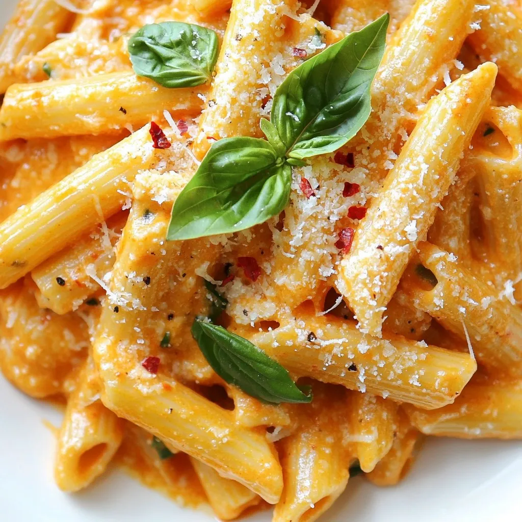 - 12 oz penne pasta - 2 tablespoons olive oil - 3 cloves garlic, minced - 1 can (28 oz) crushed tomatoes - 1 cup heavy cream The main ingredients create a rich and creamy sauce. Penne pasta holds the sauce well. Olive oil adds a nice depth of flavor. Garlic provides aroma and taste. Crushed tomatoes give the dish its base and body. Heavy cream makes the sauce smooth and luscious. - 1 teaspoon red pepper flakes - 1 teaspoon sugar - 1/2 cup fresh basil leaves, chopped - Salt and freshly cracked black pepper, to taste - Grated Parmesan cheese, for serving These flavor enhancers take the dish to a new level. Red pepper flakes add a little heat. Sugar balances the acidity of the tomatoes. Fresh basil brings a bright, herbal note. Salt and black pepper enhance all the other flavors. A sprinkle of Parmesan adds a savory finish. - Twisted fusilli - Classic spaghetti - Gluten-free options If you want to switch up the pasta, you have great choices. Twisted fusilli catches more sauce with its curves. Classic spaghetti is a timeless option that never disappoints. If you need gluten-free, many brands offer great alternatives. Each type of pasta will give you a unique dining experience. {{ingredient_image_2}} First, boil a large pot of salted water. Use about one tablespoon of salt for every quart of water. When the water reaches a rolling boil, add 12 ounces of penne pasta. Cook the pasta according to the package, usually around 10-12 minutes for al dente. Al dente means the pasta is firm but cooked. Drain the pasta and set it aside. Remember to keep one cup of the starchy pasta water for later. In a large skillet, heat two tablespoons of olive oil over medium heat. Once it’s hot, add three minced garlic cloves. Sauté the garlic for one to two minutes. Stir it constantly so it does not burn. After that, pour in one can of crushed tomatoes, about 28 ounces. Mix in one teaspoon of red pepper flakes and one teaspoon of sugar. Let the sauce simmer for about ten minutes. This helps the flavors blend and the sauce thicken. Next, lower the heat and slowly whisk in one cup of heavy cream. Keep stirring until it blends smoothly. Simmer for an extra five to seven minutes. This makes the sauce nice and creamy. Now, add the cooked penne pasta to the skillet. Toss it gently to coat the pasta in the sauce. If the sauce seems too thick, add some reserved pasta water a little at a time. This will help get the right creamy texture. Finally, mix in half a cup of fresh chopped basil. Season with salt and cracked black pepper to taste. Serve the pasta hot, topped with grated Parmesan cheese. Enjoy your meal! To make the best vodka sauce, adjust the spice levels with red pepper flakes. Start with one teaspoon. If you want more heat, add more. This spice gives the sauce a nice kick without being overpowering. Another key tip is to use reserved pasta water. After cooking the pasta, save a cup of that starchy water. When mixing the pasta with the sauce, add some water if the sauce is too thick. This helps create a creamy, smooth finish. Garnishing your dish makes it look and taste even better. Add fresh basil leaves on top for color and flavor. A light drizzle of olive oil adds richness and shine. For serving, sprinkle grated Parmesan cheese over the pasta. This cheese adds a salty, nutty flavor that enhances the dish. You can also serve the pasta with a side of garlic bread for a complete meal. Choosing the right skillet is important for making the sauce. A large, heavy skillet spreads heat evenly, which helps cook the sauce properly. To enhance flavors, start by sautéing the minced garlic in olive oil. This step brings out the garlic's sweetness and depth. Avoid browning the garlic, as it can turn bitter. Just cook until fragrant, then add the crushed tomatoes. Pro Tips Use Fresh Basil: Fresh basil adds a vibrant flavor and aroma to your pasta. Add it at the end to preserve its bright color and taste. Adjust Spice Levels: Modify the red pepper flakes to suit your taste. Start with a small amount and increase it gradually for the perfect heat. Save Pasta Water: The starchy pasta water is a great tool to adjust the sauce's consistency. Add it gradually to achieve the desired creaminess. Enhance with Parmesan: Don't skimp on the grated Parmesan cheese! It adds depth and a savory finish that complements the creaminess of the sauce. {{image_4}} You can switch up your vodka pasta by using a marinara sauce base. It adds a nice twist. Marinara is rich and brings out the tomato flavor. This change can make it lighter yet still tasty. You can also explore different types of cream. Instead of heavy cream, try half-and-half or coconut cream for a dairy-free option. Each type gives a unique taste. Want to add protein to your dish? You can easily incorporate chicken or shrimp into your vodka pasta. Simply cook the protein first, then add it to the sauce. This addition makes the meal heartier. If you prefer vegetarian options, mushrooms work great. Sauté mushrooms until golden brown for a nice texture. They absorb the sauce well and add depth. To enhance the flavor, try infusing your sauce with additional herbs. Fresh thyme or oregano can add a lovely aroma. You can also experiment with different types of cheese. While Parmesan is classic, goat cheese or ricotta can bring a creamier texture. Each choice offers a new taste experience. After you enjoy your vodka pasta, let it cool first. Place the pasta in a bowl. Use a spoon to break up any clumps. Store it in the fridge for up to three days. For storage containers, use airtight options. Glass containers work well. They help keep flavors fresh. To reheat leftovers, use a skillet. Add the pasta and a splash of water. Heat it on low until warm. Stir often to mix in the sauce. You can also use a microwave. Place the pasta in a microwave-safe bowl. Cover it loosely and heat in short bursts. Stop to stir every minute. This helps prevent the sauce from separating. You can freeze vodka pas